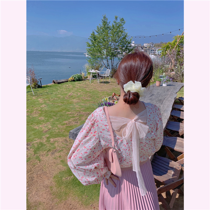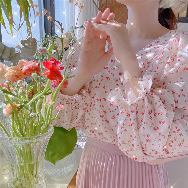 PinkstarShop autumn new bandage bow exquisite pearl chiffon shirt pattern long-sleeved sweet shirt