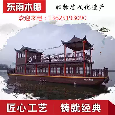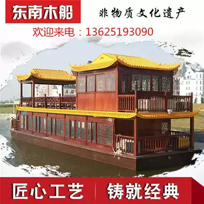 Wooden boat Painting boat Large water dining hall double-decker solid wooden leisure antique house Electric sightseeing tourist boat