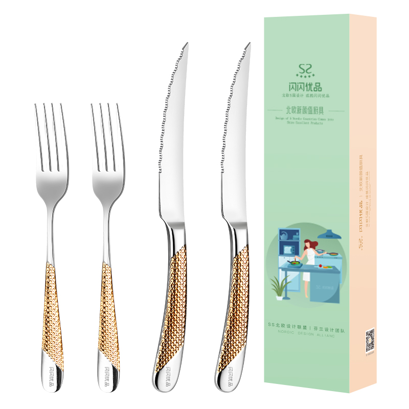2 sets of real gold plated knives, forks and spoons 2 sets of real gold plated knives, forks and spoons 2 sets of 8-inch steak plates 2 sets of 10-inch steak plates