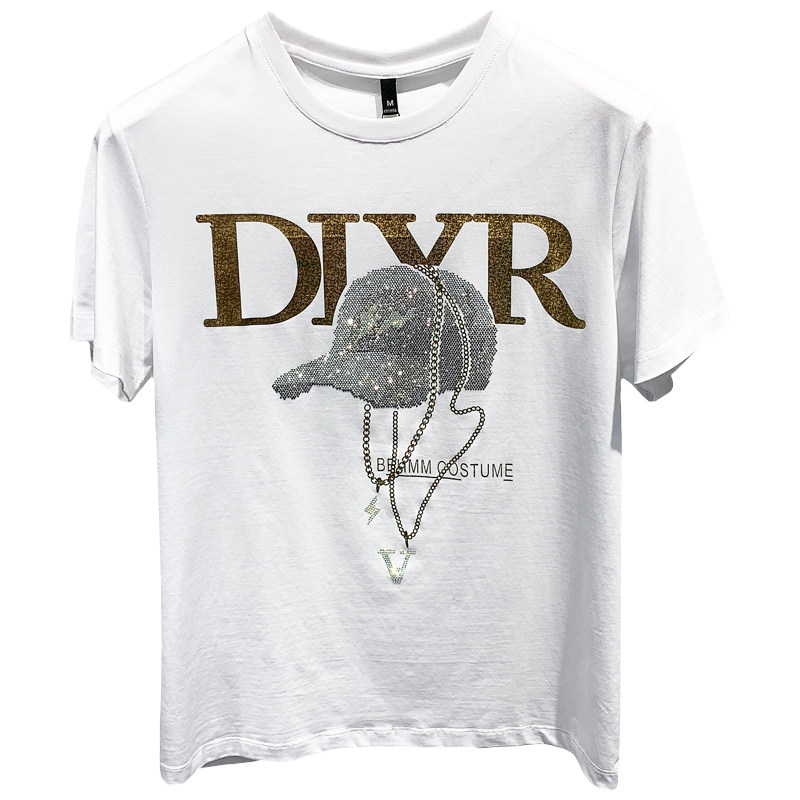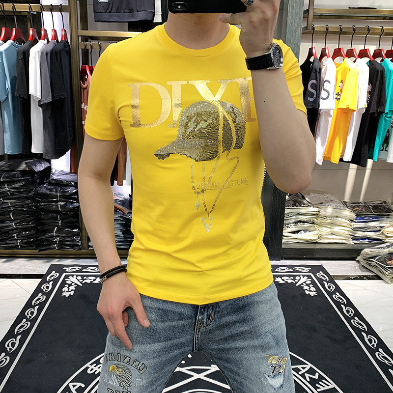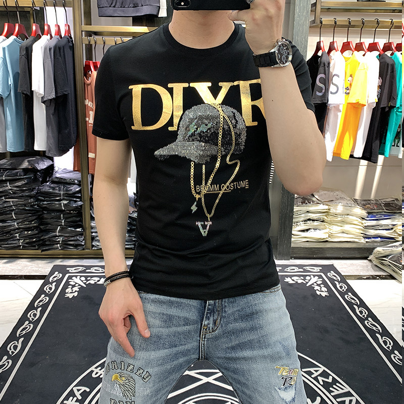 European station trendy brand short-sleeved T-shirt men's summer new self-cultivation trend personality letters hot diamond printing round neck half-sleeves