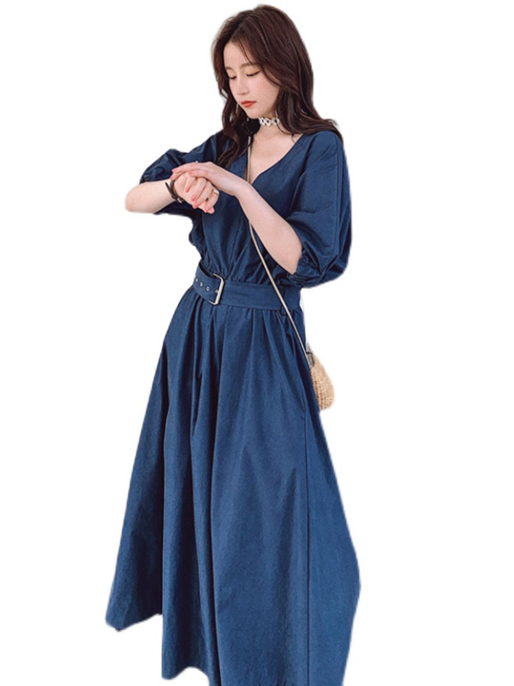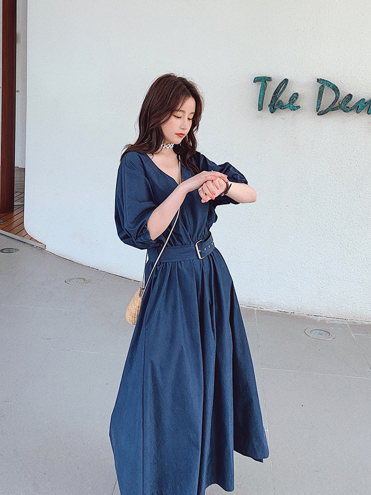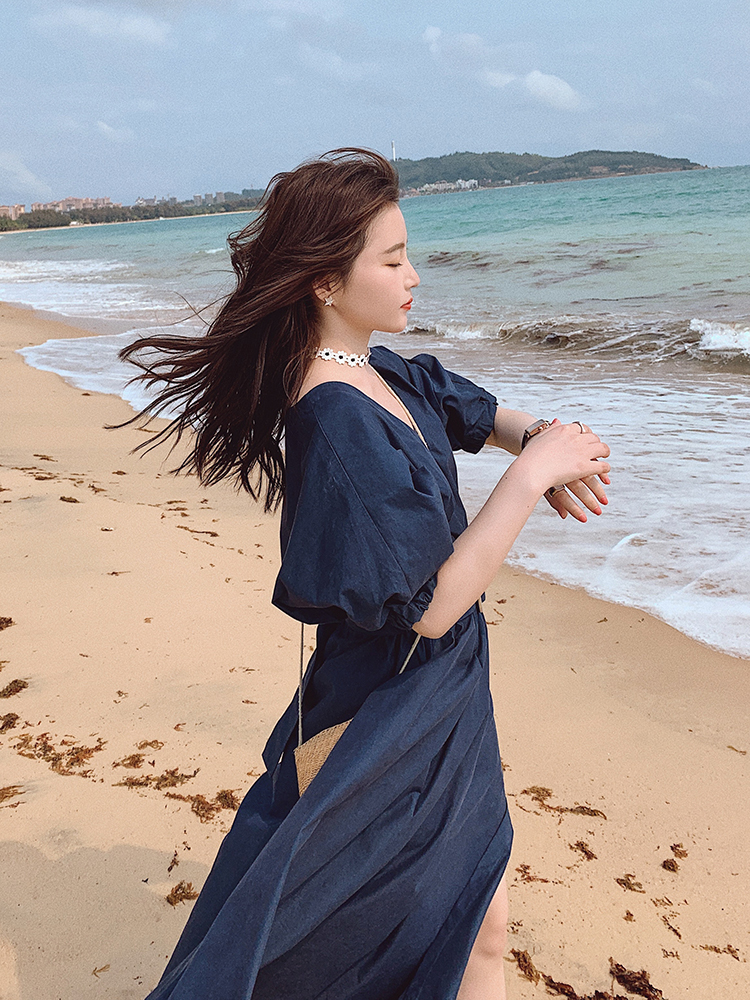 Lecea Alice bubbles sleeves Ocean dress 2022 Summer new V collar Academy Wind collection waist Temperament Little Dresses