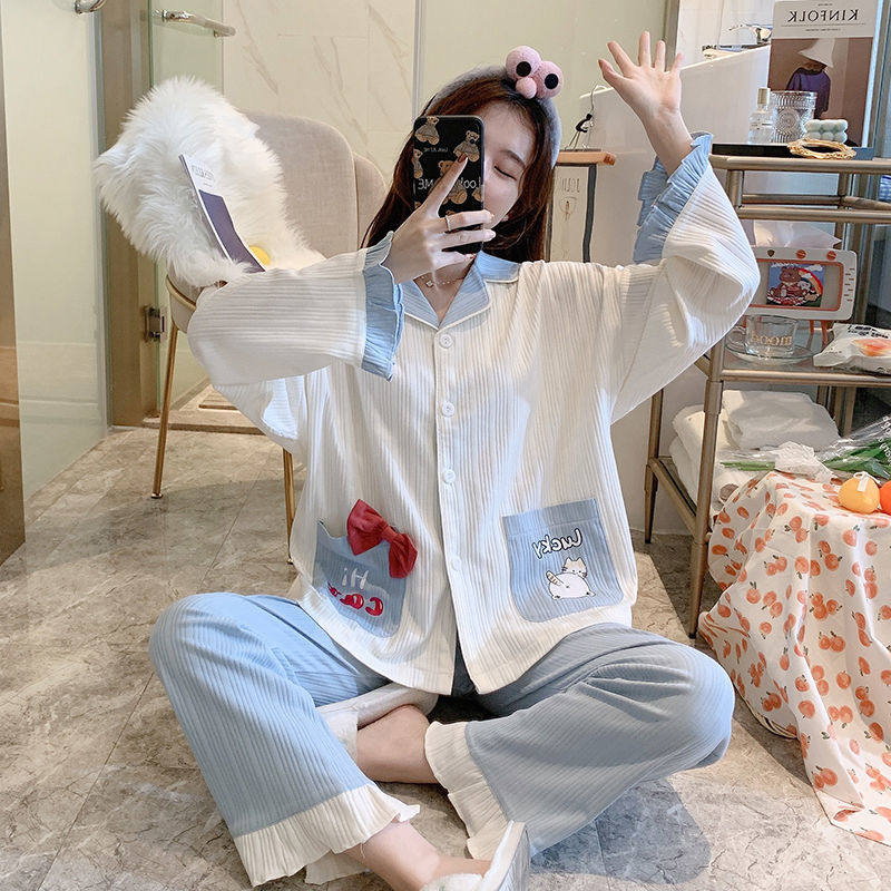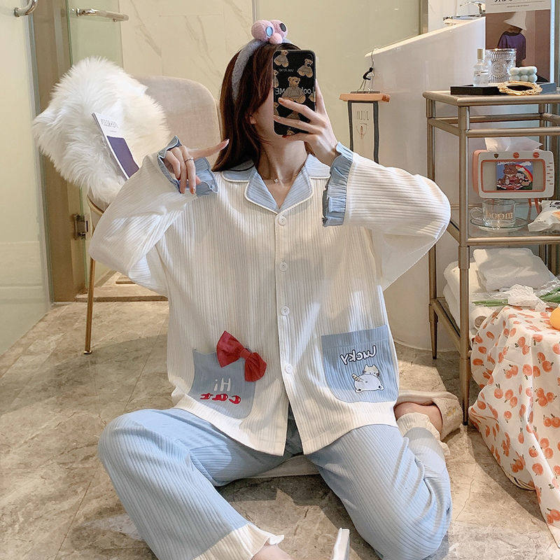 Autumn Winter Pyjamas Woman Spring Autumn Season Long Sleeve Cute Summer Home Conserved Cardiovert Two Style Suit Net Red Popcorn Cat Cotton