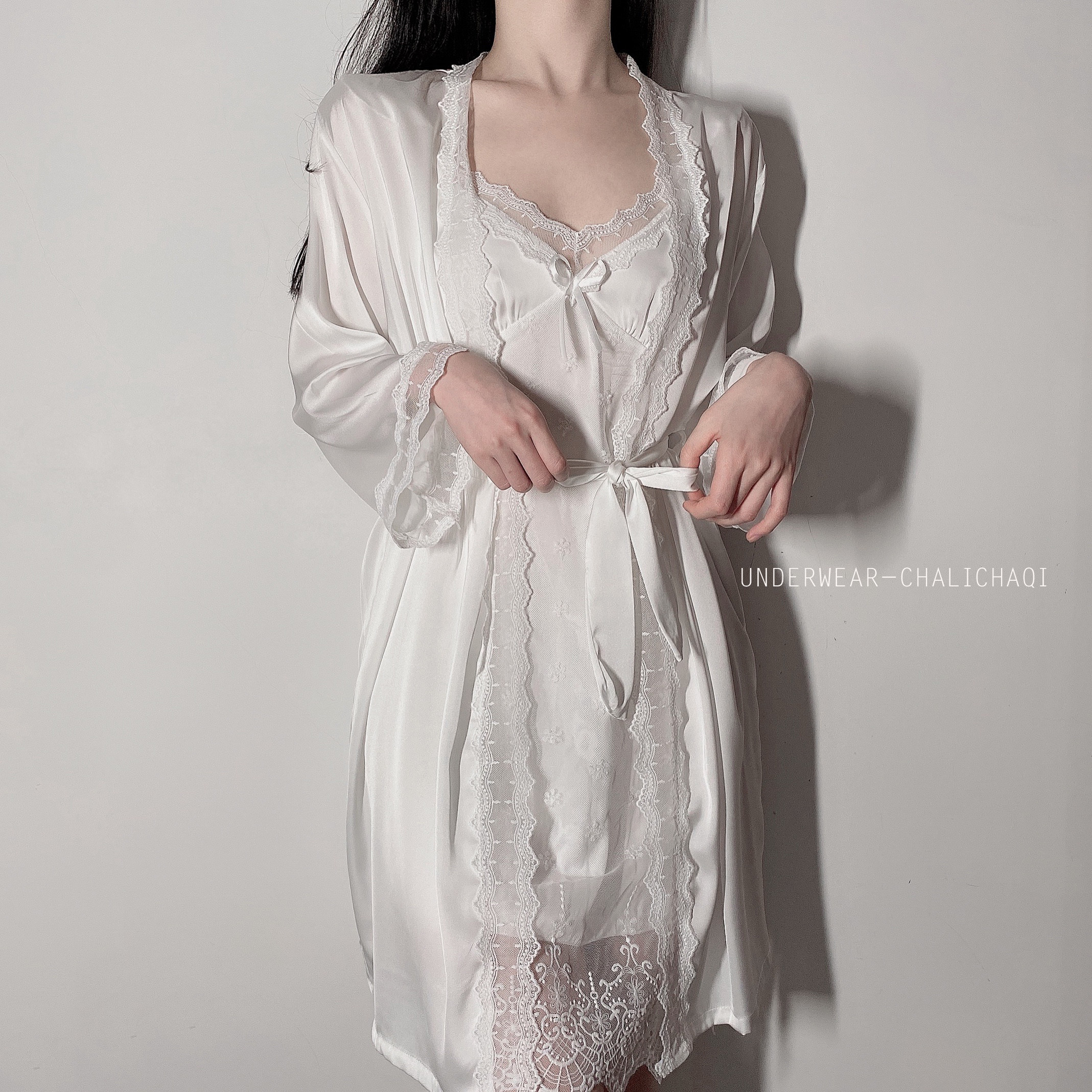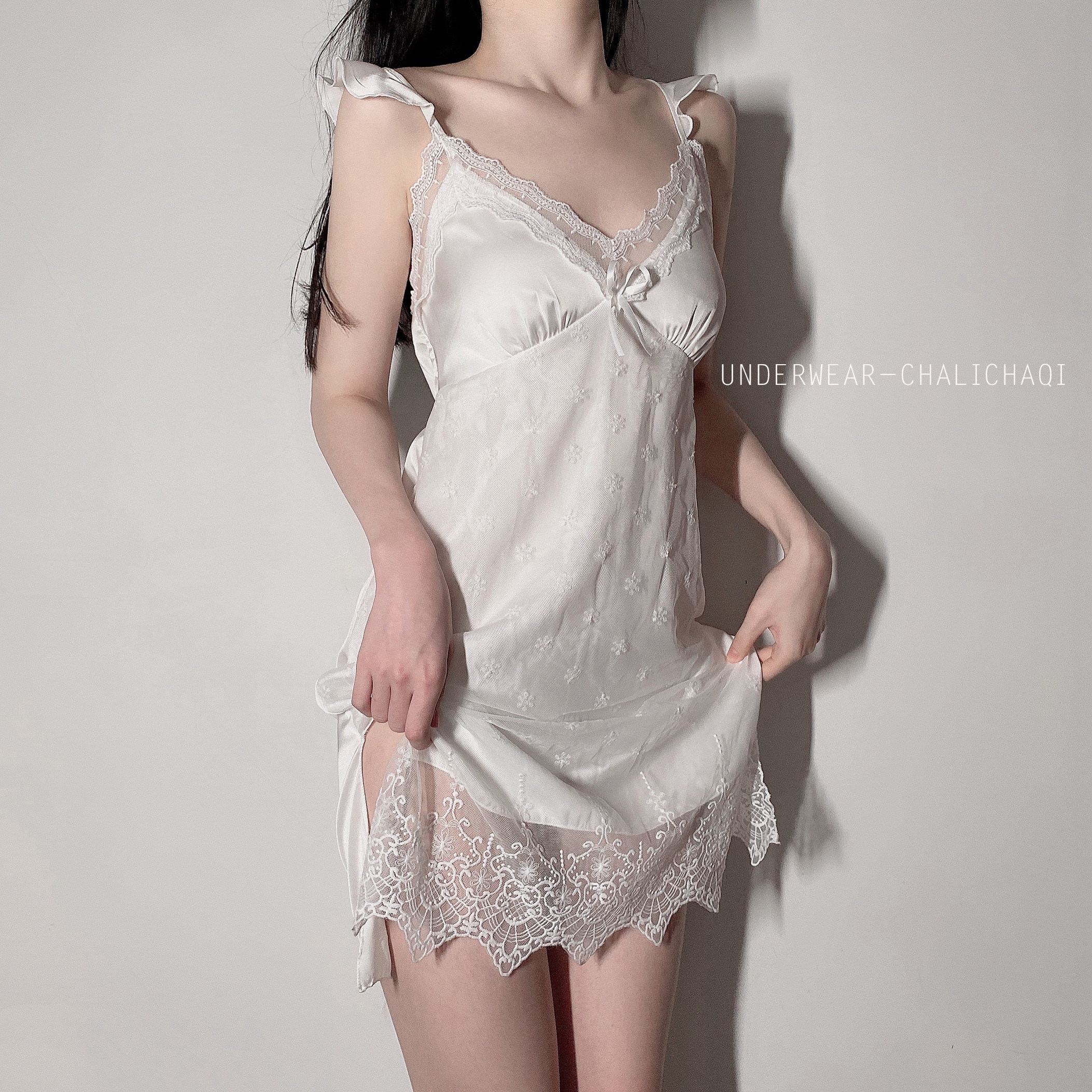 Sexy Sleepwear Women's Summer Ice Screen Red Wind Sleep Gown Lace Slim white pure desire Wind with chest cushion Sling Sleeping Dress