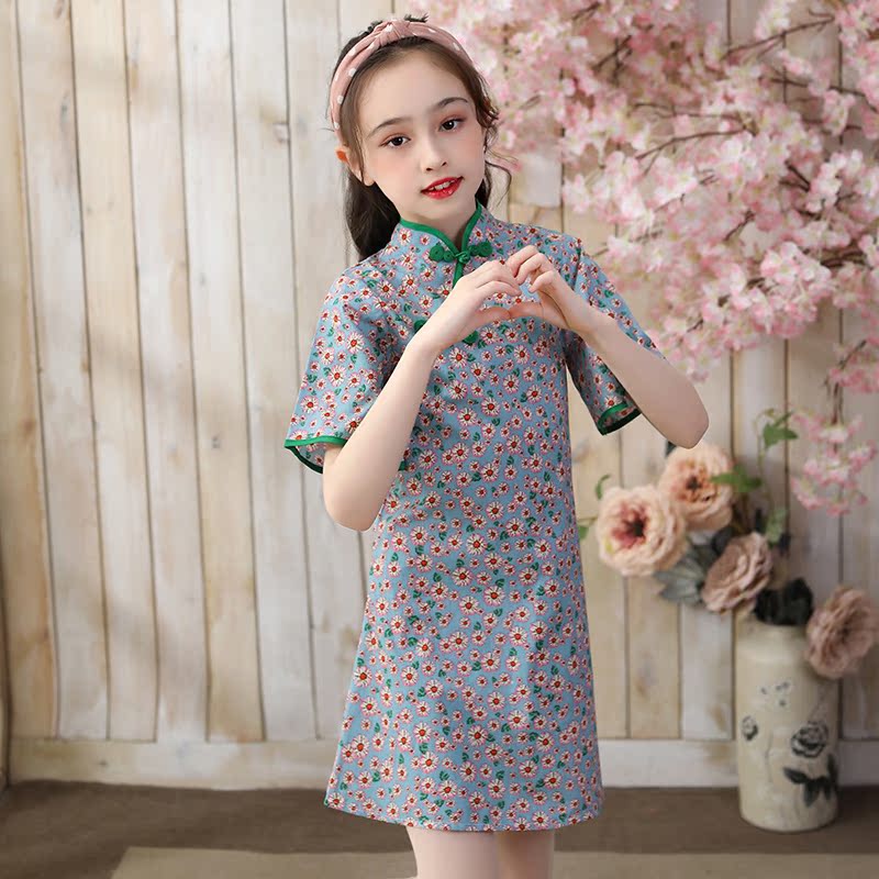 Children's cheongsam autumn girls Tang suit Chinese style retro show catwalk Chinese style thin section short-sleeved floral dress