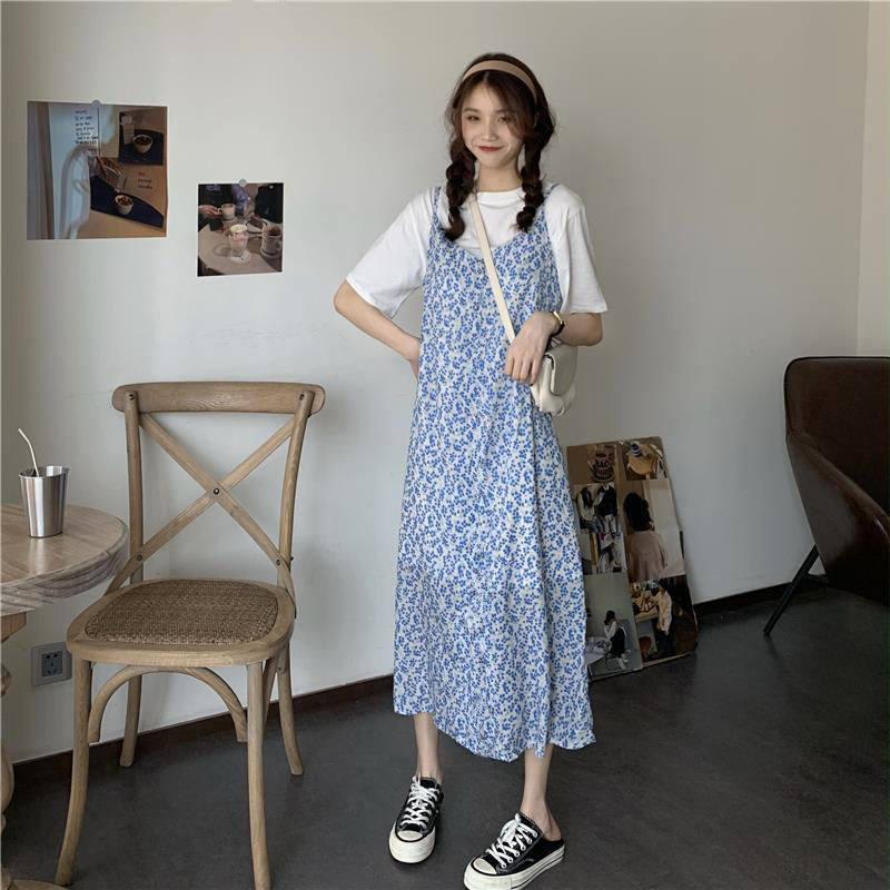 One-piece two-piece set Foreign school age-reducing short-sleeved T-shirt Blue floral sundress Student fashion small fresh suit summer
