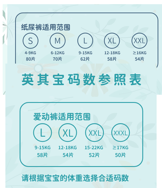 Diaper S size 80 pieces Diaper M size 70 pieces Diaper L size 62 pieces Diaper XL size 58 pieces Diaper XXL size 54 pull-up pants L size 58 pull-up pants XL size 54 pieces