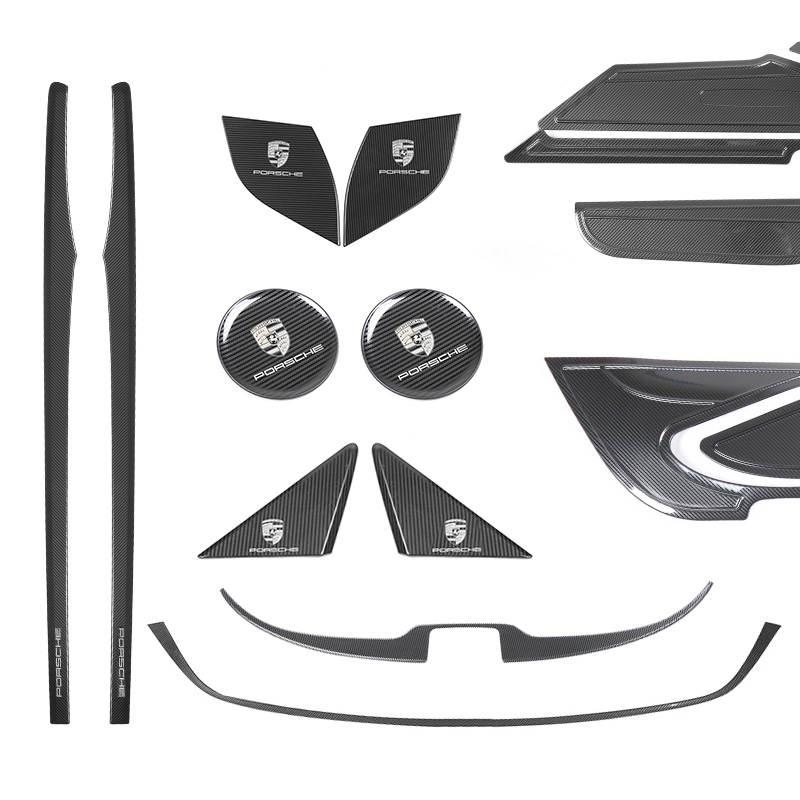 718 (dashboard air vent decorative frame) carbon fiber - 4 pieces of 718 (engine intake) carbon fiber - 2 pieces of 718 (tail trim strip) carbon fiber - 1 piece of Cayman (trunk guard) carbon fiber - 1 piece of 718 (door trim strip) carbon fiber - 2 pieces of 718 (door decoration cover) carbon fiber - 2 pieces of 718 (outer triangle trim) carbon fiber - 2 pieces of Cayman (reading light decorative cover) carbon fiber - 2 pieces of Boxster (reading light decoration cover) Carbon fiber - 1 piece cayman (trunk oil cover) carbon fiber - 2 pieces 718 (door anti-kick pad Cayman standard) carbon fiber -6 pieces of 718 (door kick pad Cayman S standard) carbon fiber -6 pieces 718 (car Door anti-kick pad Boxster label) carbon fiber - 6 pieces pack 718 (door anti-kick pad Boxster S standard) carbon fiber -6 pieces of 718 (dashboard decorative frame) carbon fiber - 3 pieces of 718 (inner door bowl - anti-scratch) carbon fiber 2 pieces set 718 (outer door bowl - scratch-resistant) carbon fiber 2-piece set 718 (headlight strip) carbon fiber 2-piece set 718 (tail light strip) carbon fiber 2-piece set 718 (stainless steel built-in sill bar) carbon fiber 2-piece set 718 (stainless steel external threshold bar) Carbon fiber 2-piece set 718 (exterior mirror trim cover) true carbon fiber 2-piece set 718 (inner door puller panel) carbon fiber 2-piece set Cayman (center-out panel) carbon fiber 6-piece boxster (center-control panel) carbon fiber 6-piece set 718 ( Tank protective cover) carbon fiber 1 piece set Porsche door lock cover (4 pieces) carbon fiber 718 (outer door hand-holding decorative cover) true carbon fiber -2 pieces Cayman (inside and outside full set) 54 pieces Boxster (inside and outside full set) 52 pieces