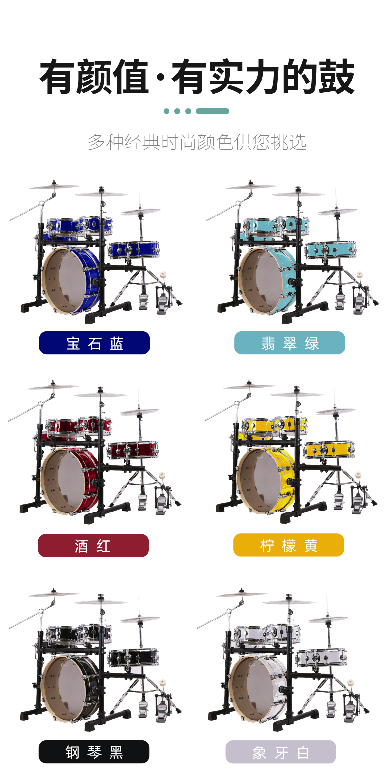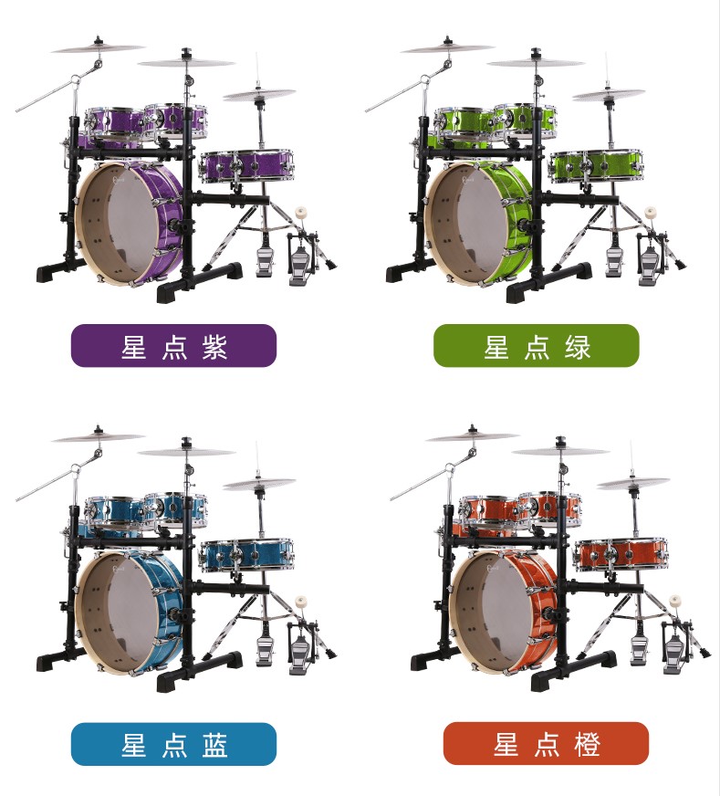 Five drums three-cymbal (emerald green) five-drum triangal (wine red) five-drum triangal (lemon yellow) five-drum triangal (piano black) five-drum three-cymbal (ivory white) five-drum three-cymbal (star white) five-drum three-cymbal (star white)