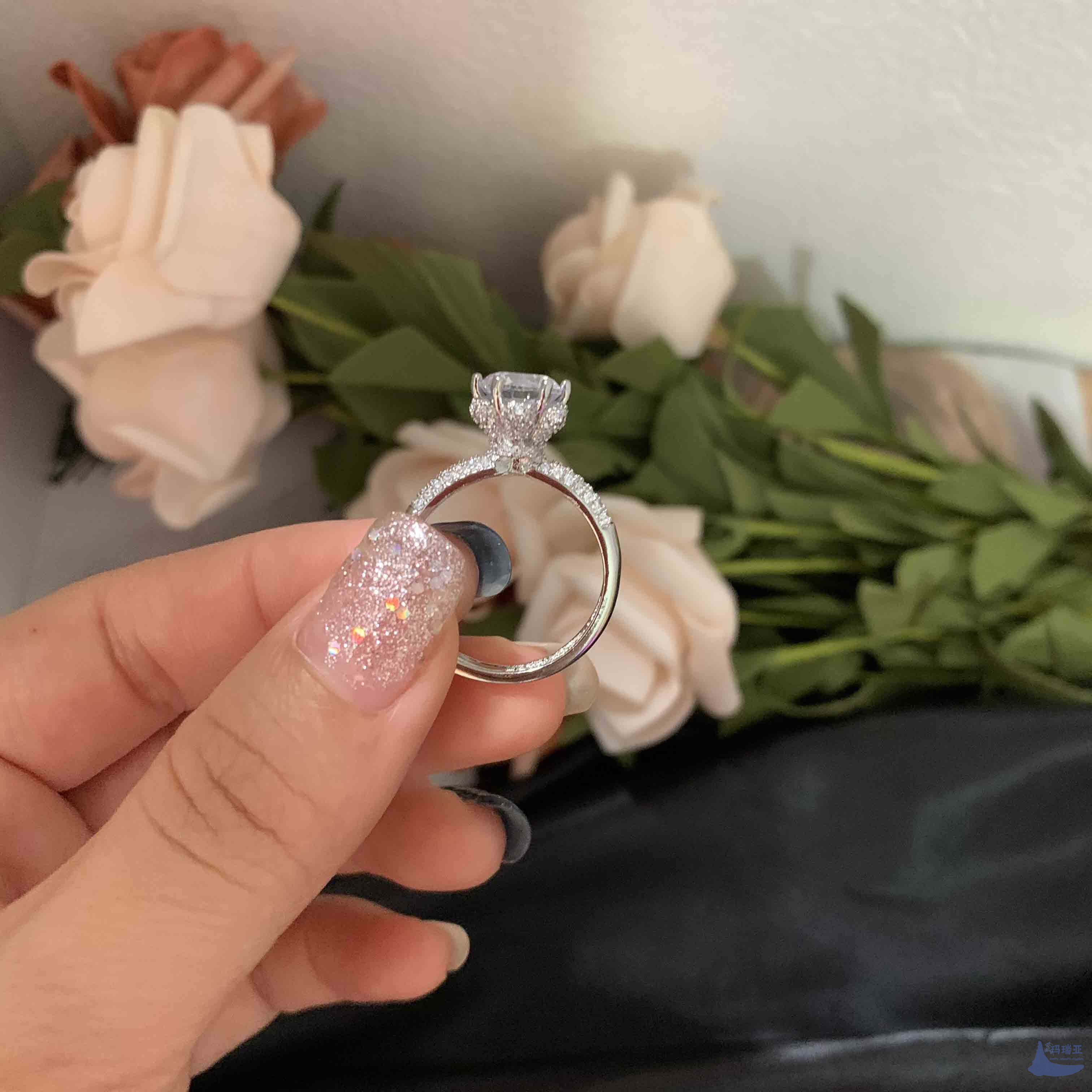 Marry Live Hot Imitation USA Imported Mosang Flash Fire Color Ring Carat Claw Emulation Full Drill Lady Ring