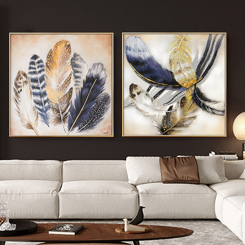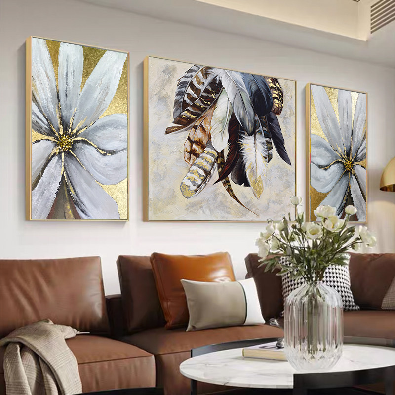 Hand-painted oil painting entrance American light luxury golden feather triptych decorative painting European living Room background wall Gold leaf mural