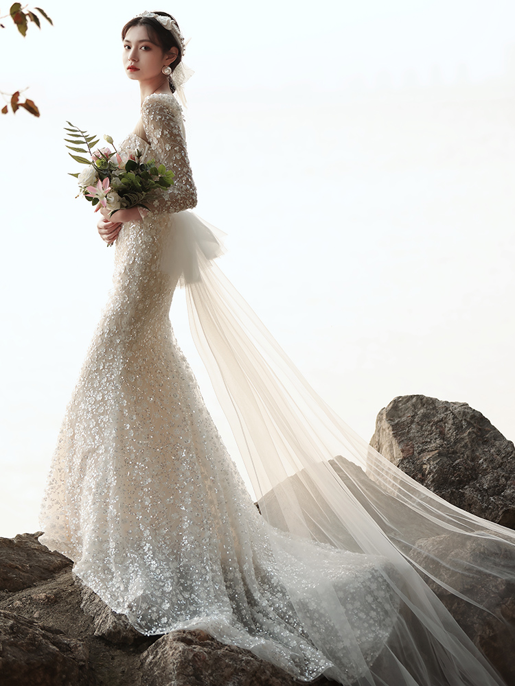 French light wedding dress 202021 new bride temperament simple Princess wind fish tail niche fairy wedding dress dress dress