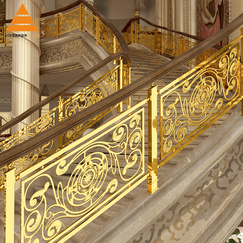 High-end hotel aluminum alloy curved solid wood stair handrail Villa rotating copper guardrail Light luxury household railing European style
