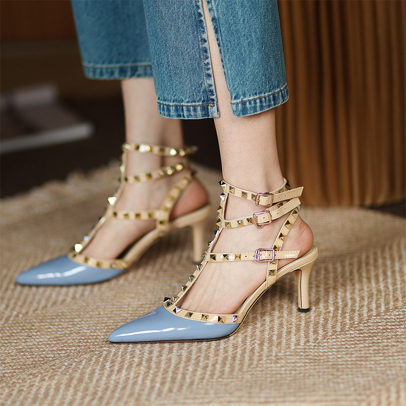 Baotou one-word strap sandals women's 2022 new summer European and American patent leather rivets Roman stiletto high-heeled pointed-toe single shoes