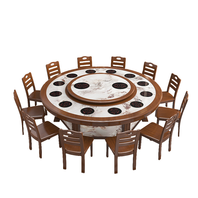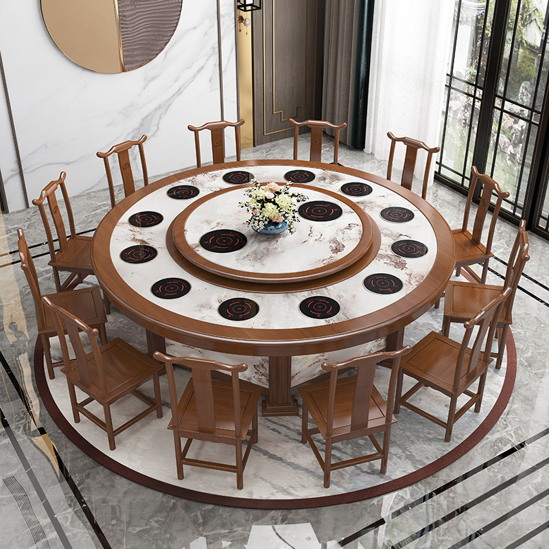 Hotel electric dining table and chair combination 18 people solid wood large round table club box new Chinese automatic turntable hot pot table