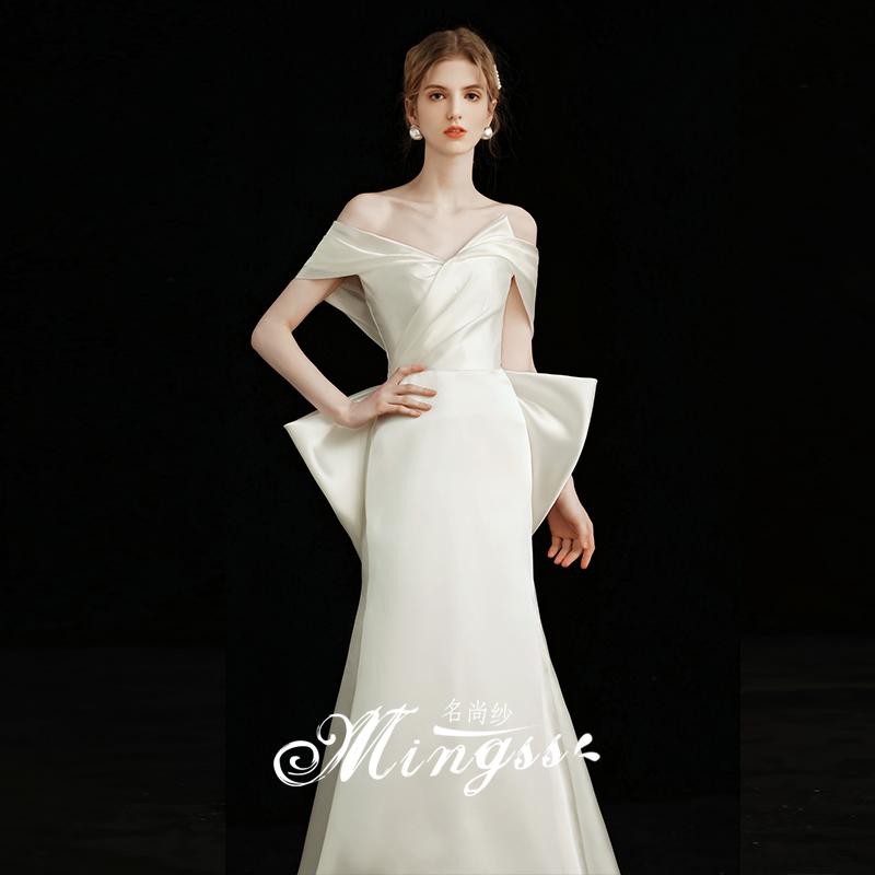 French wedding dress 2023 new bride wedding dress with a word shoulder temperament of the simple atmosphere greeting dress