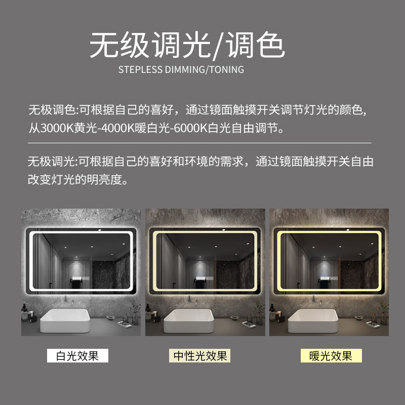 (Customizable size)Please contact customer service (note)Default horizontal hanging vertical hanging Please note (warm light)Single touch no defogging (warm light)Dual touch defogging (warm light)Dual touch defogging time temperature