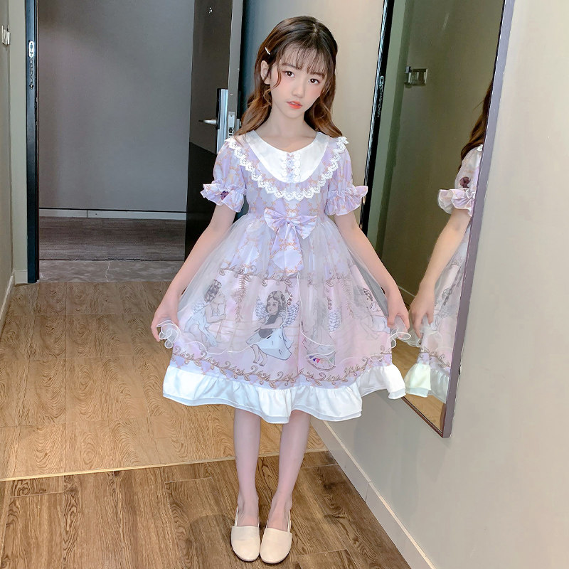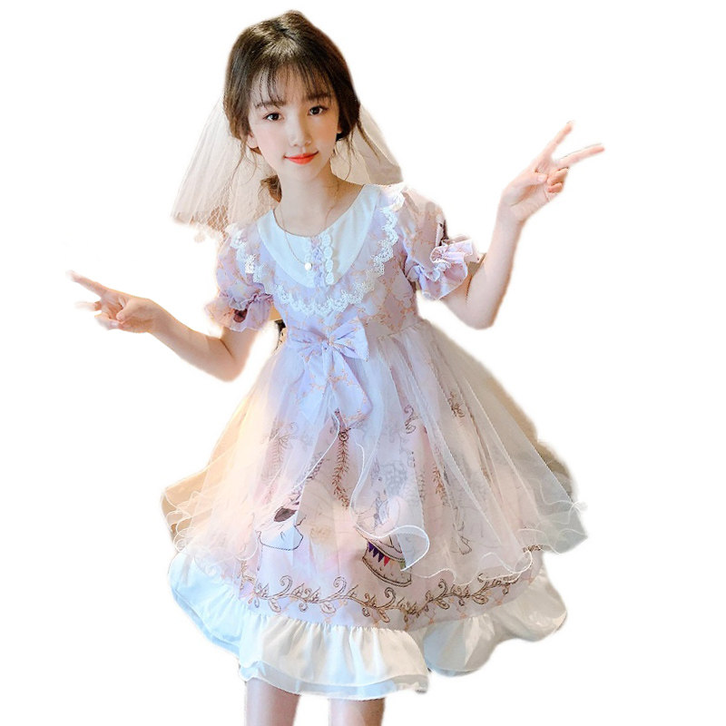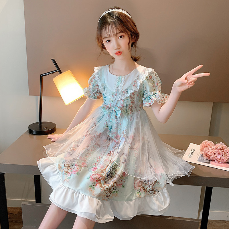 Summer children's 10-year-old retro floral a-line gauze skirt girls Western style short-sleeved Lolita dress net red