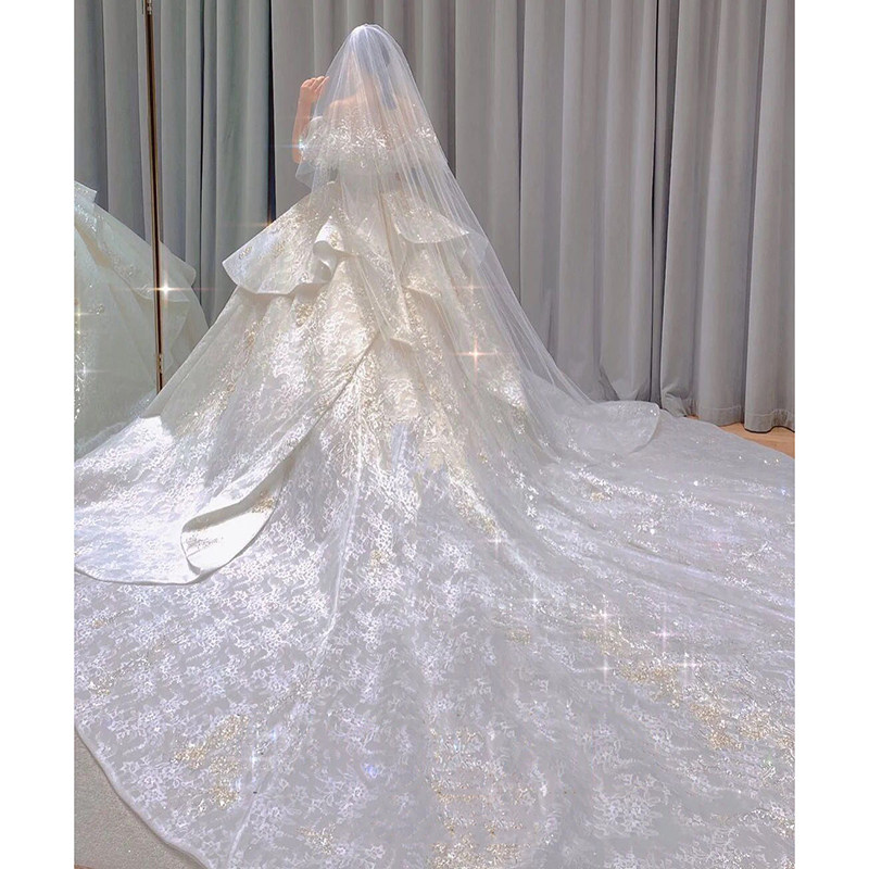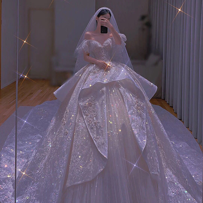 One word shoulder light main wedding dress 2021 new bride high-end heavy industry luxury trailing French high-grade texture 2022 women