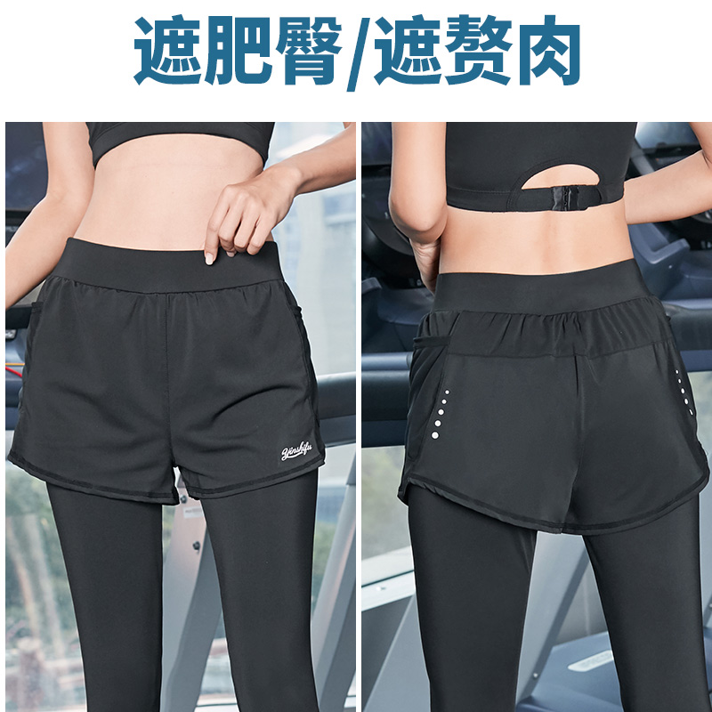 Plus size sports pants female fat MM yoga shorts three-point pants tight running fitness fake two-piece summer 200 kg