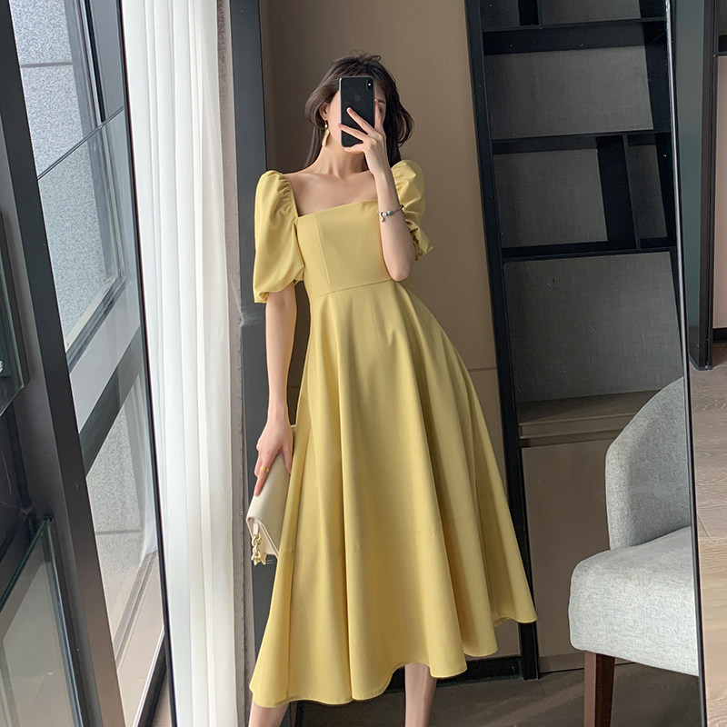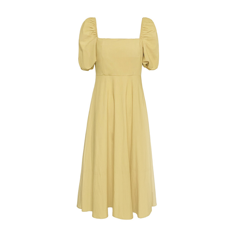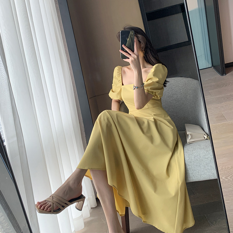 FT GUOGE Yellow Dress Woman 2023 Summer New Fair Collects Waist Skin Bubble Sleeve Sleeve