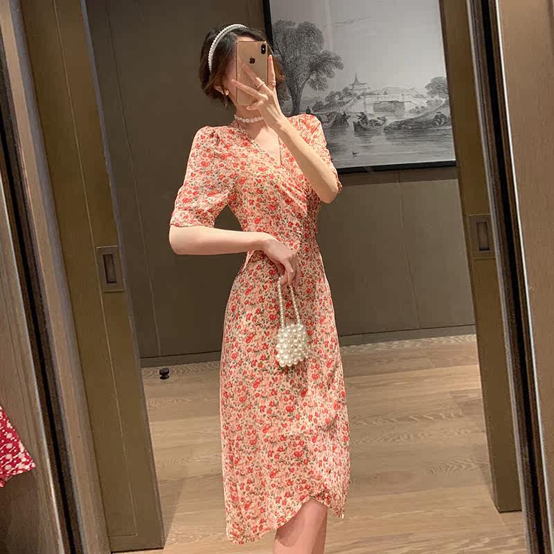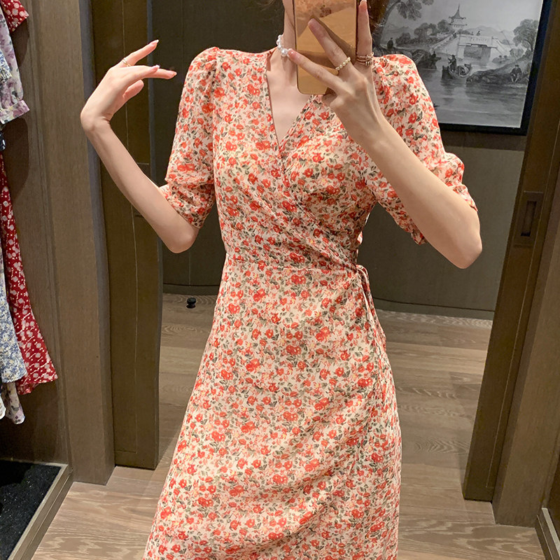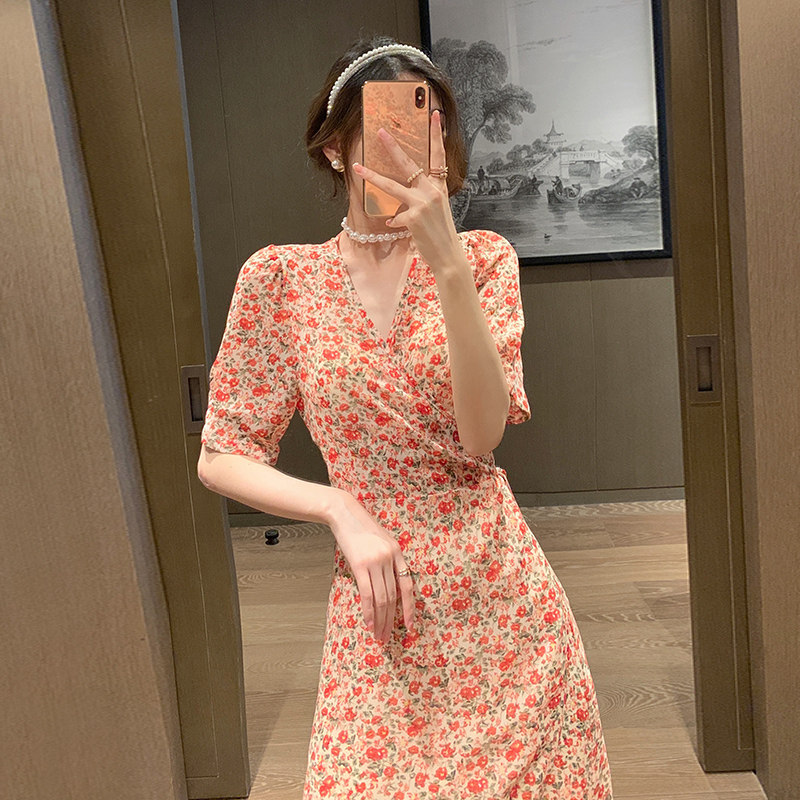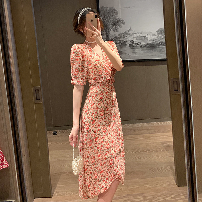French small floral dress 2021 summer new V-neck sweet temperament waist irregular chiffon dress