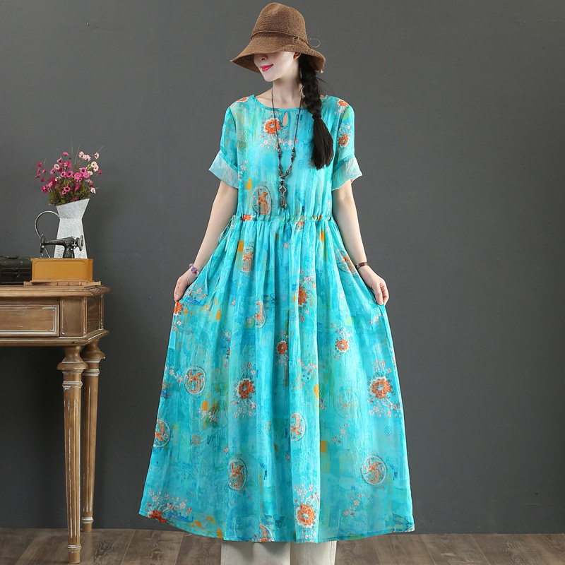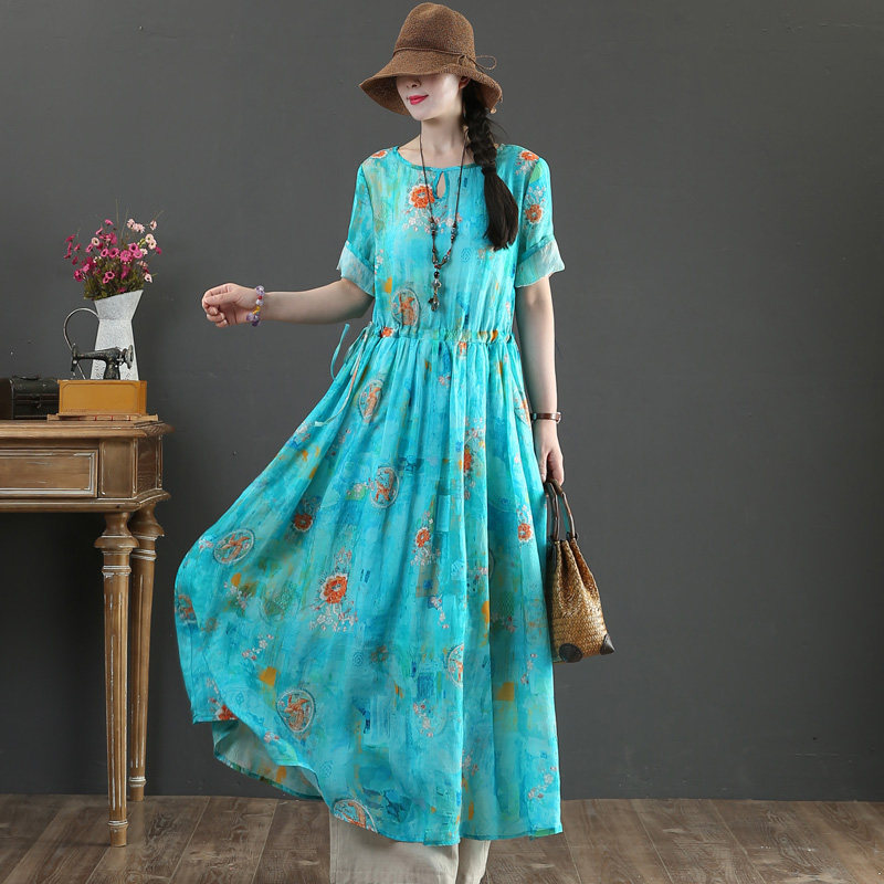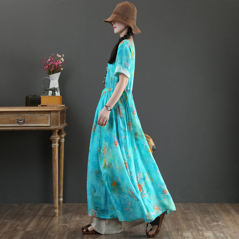 September Kaka Original Design High Count Pure Hemp Large Swing Skirt Round Neck Short Sleeve Long Dress 3501