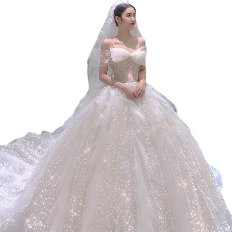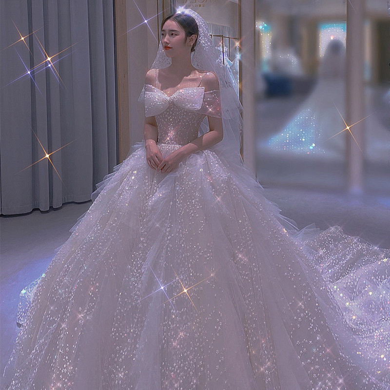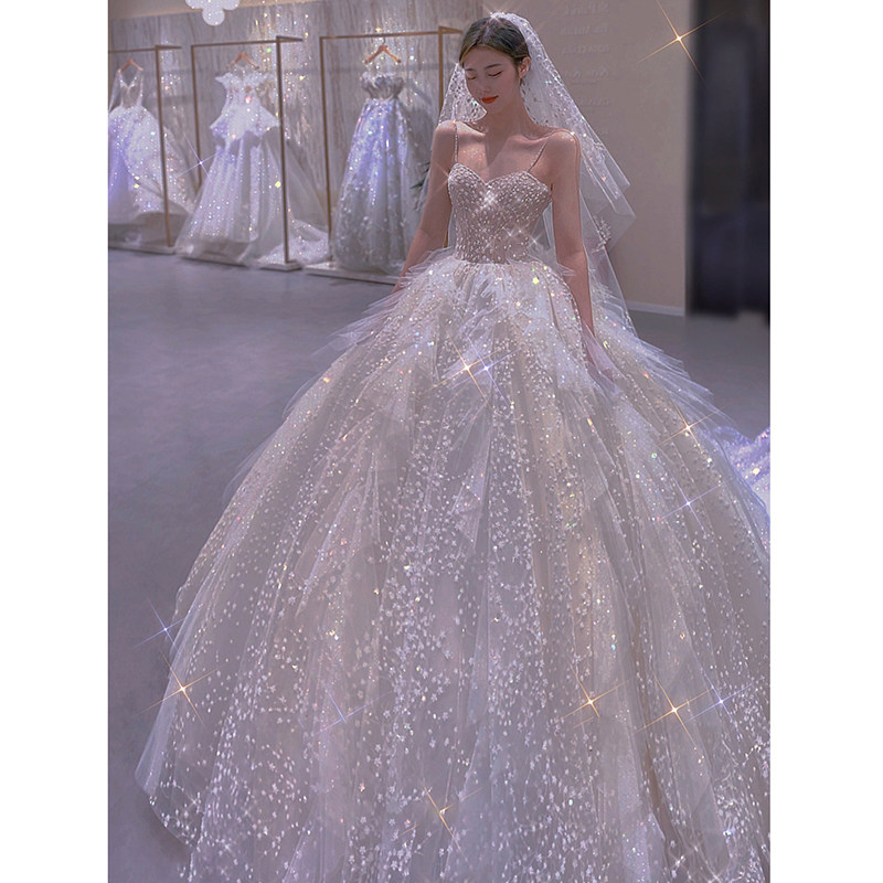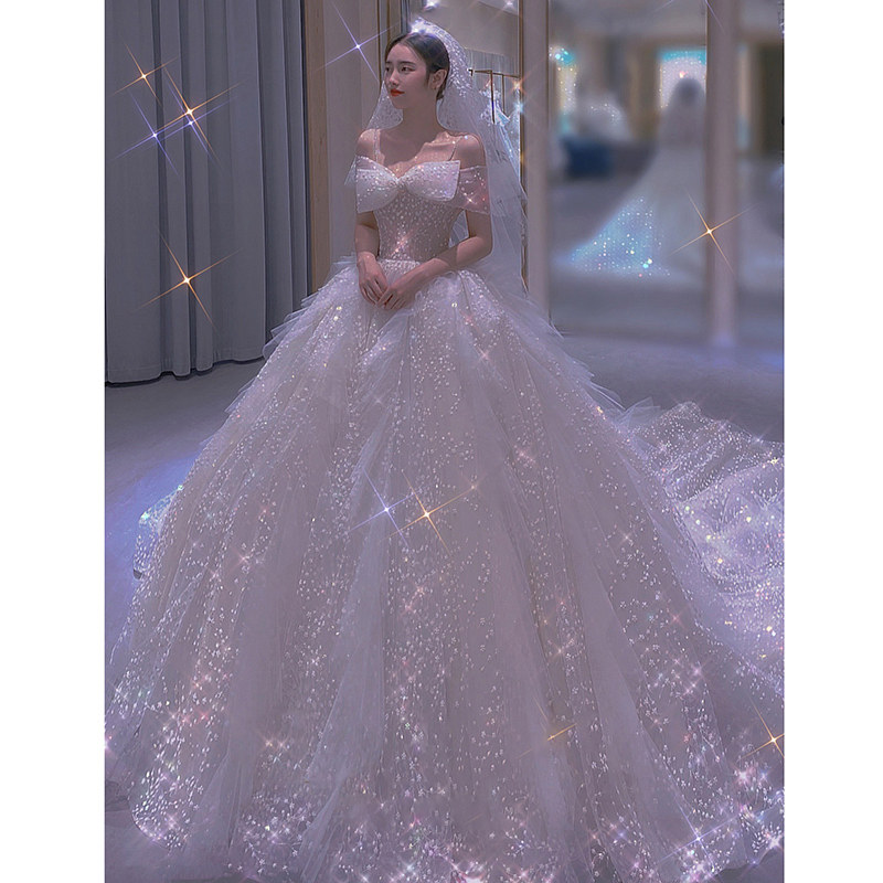 Light main wedding dress 2021 new bridal sling word shoulder small French thin tail summer starry sky