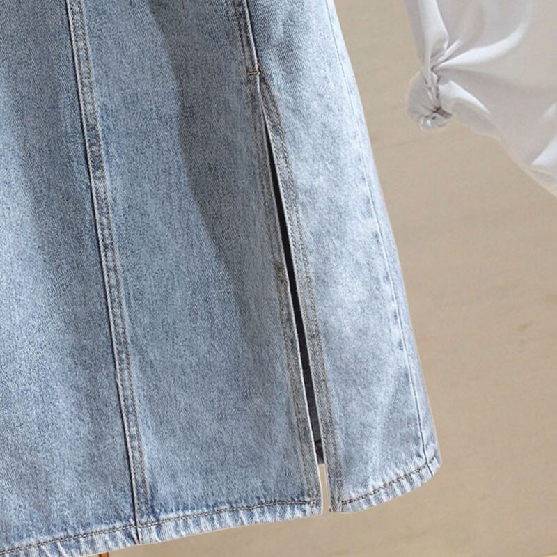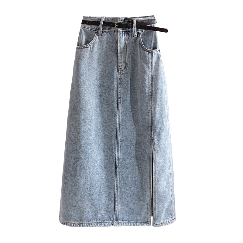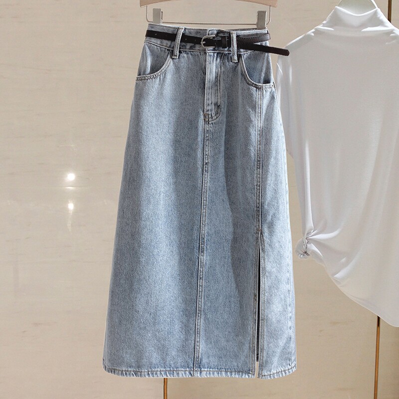 2022 new light-colored high-waisted denim skirt women's mid-length Korean version with slits and thin A-line bag hip long skirt