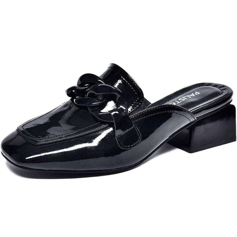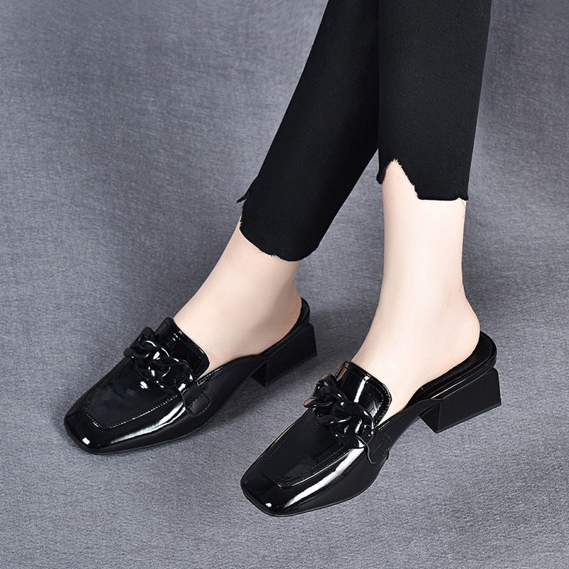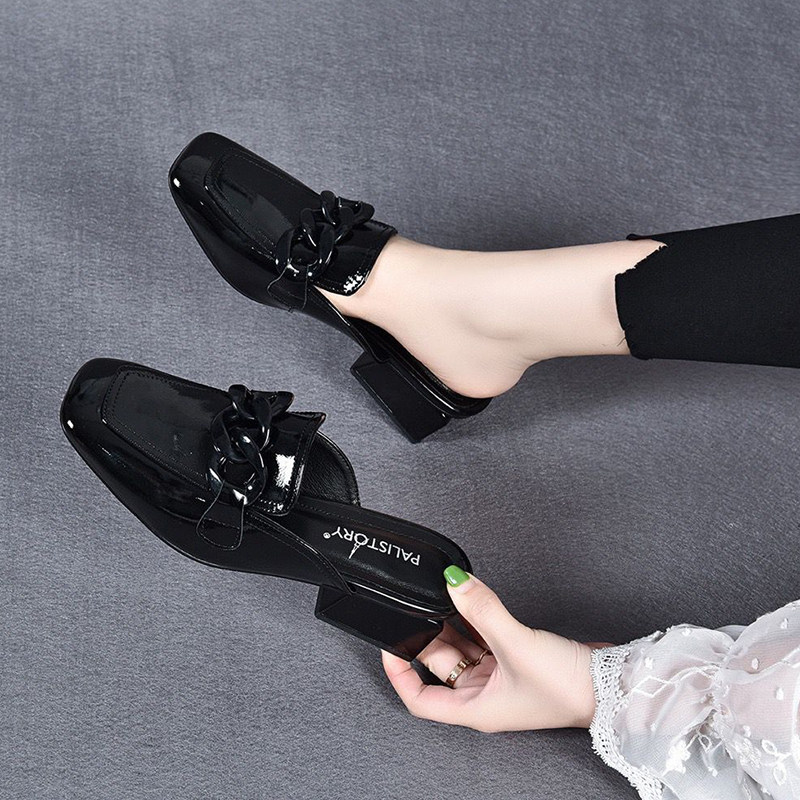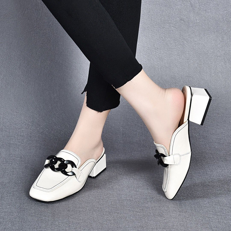 Genuine leather women shoes high heel shoes Baotou slippers 2022 spring and summer new small leather shoes coarse heel square head fashion slippers worn out