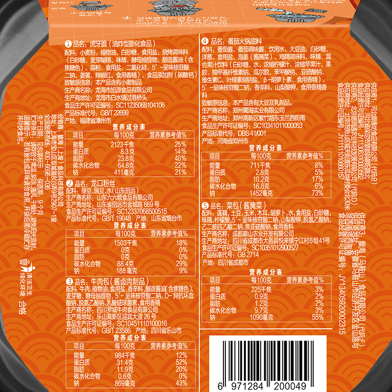 Vegetable pack 150g Tomato hot pot bottom 90g beef package 80g fan package 25g tiger teeth crisp 20g ingredients detailed in packaging