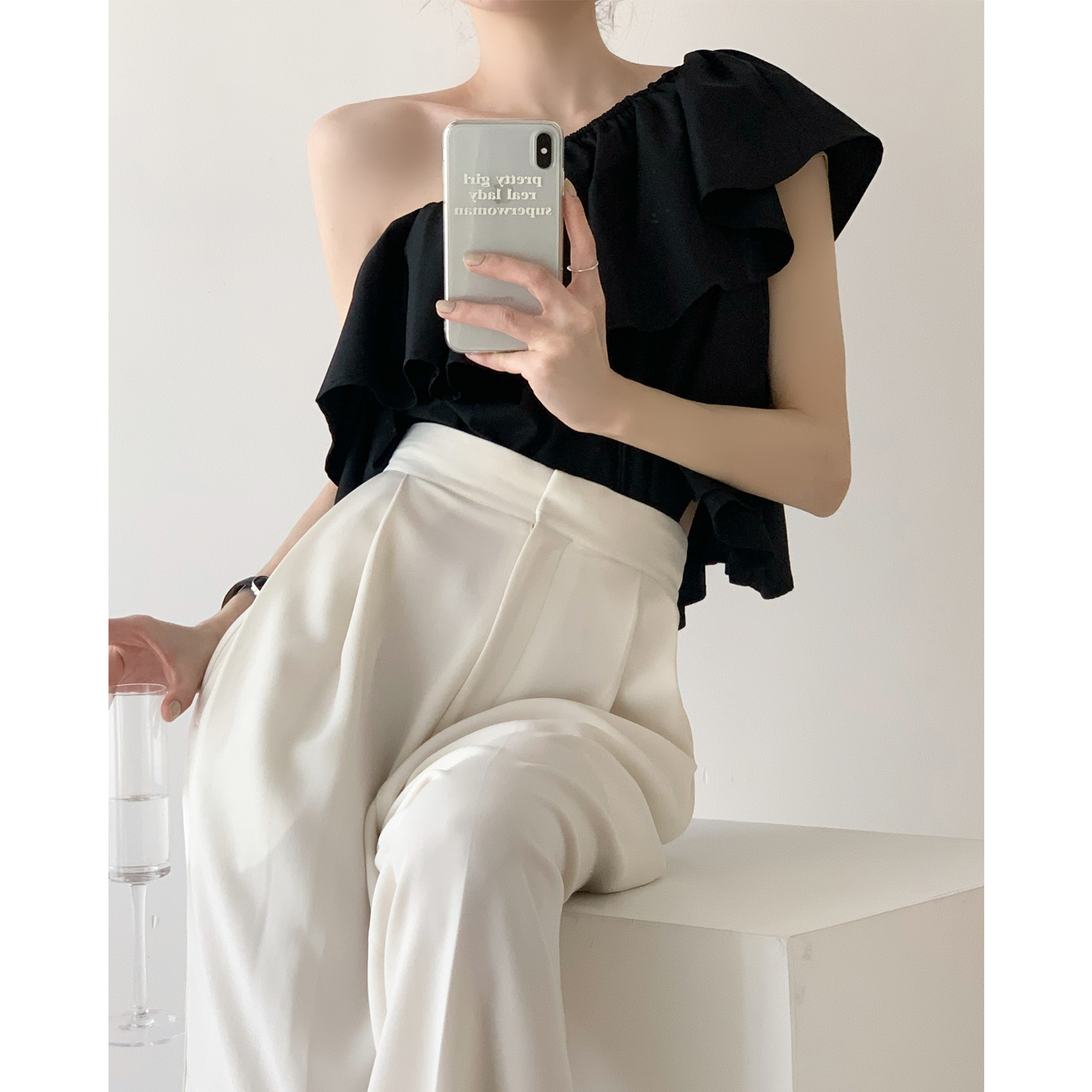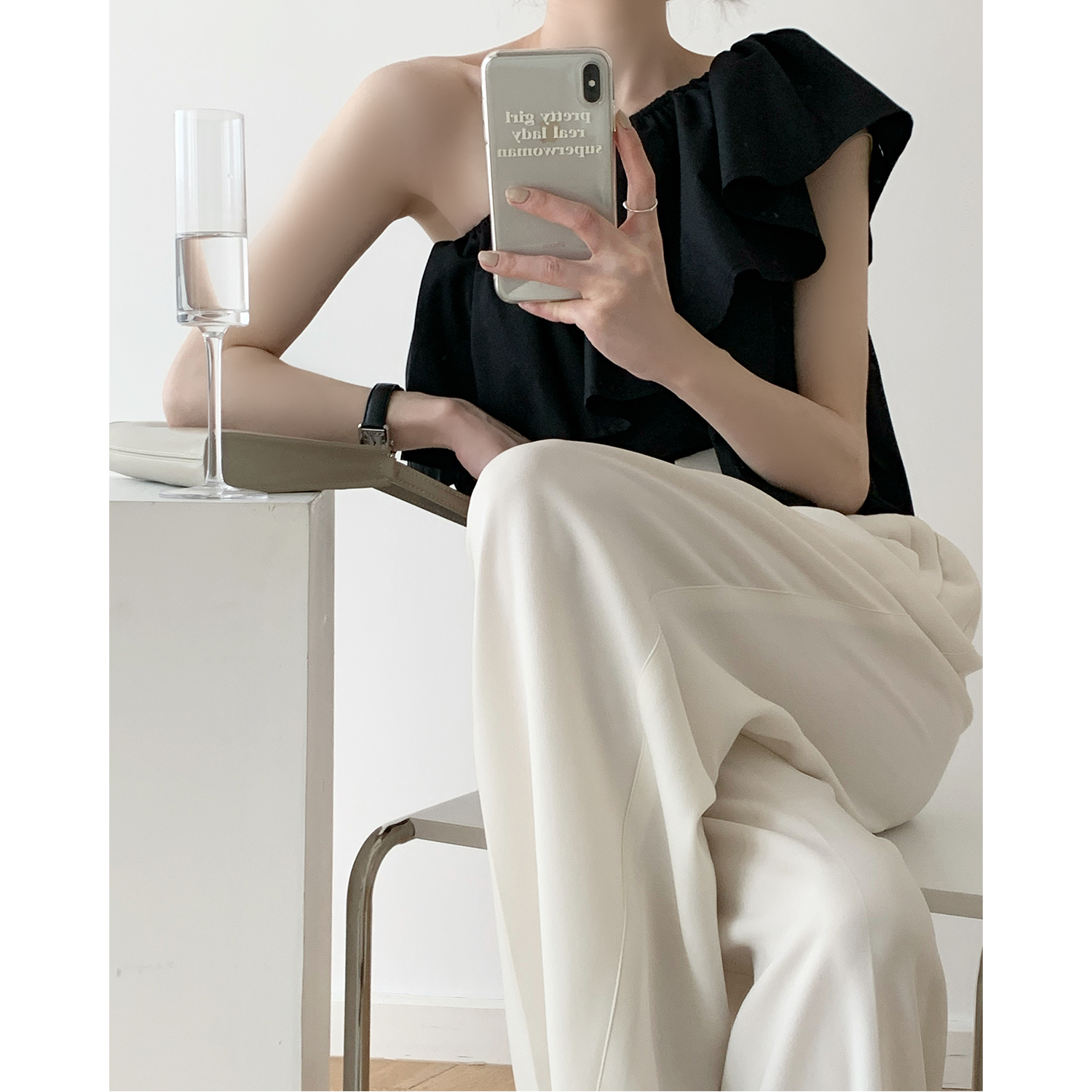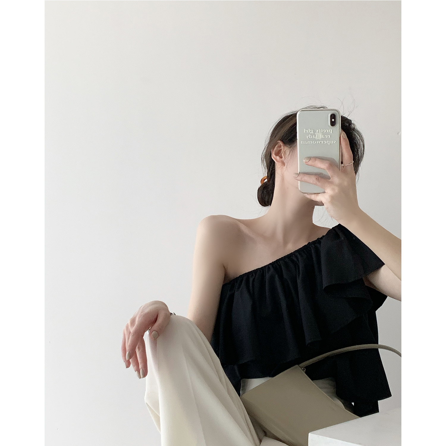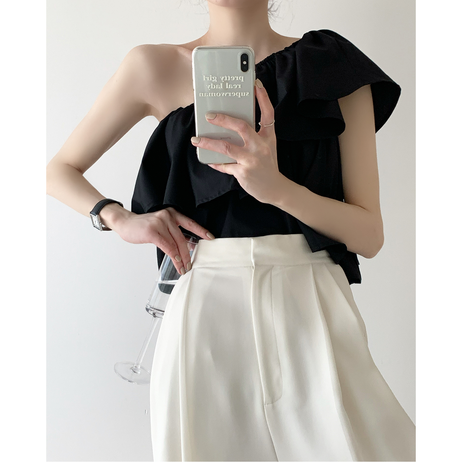 Careful machine inclined shoulder shirt female sensary shoulder leakage lock bone design sensation small single shoulder sleeveless blouse woman 2022 summer