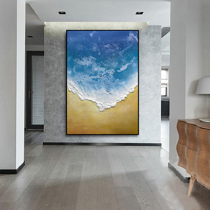 Hand-painted light luxury sea view porch decorative painting vertical version modern minimalist living room background wall hanging painting corridor end mural