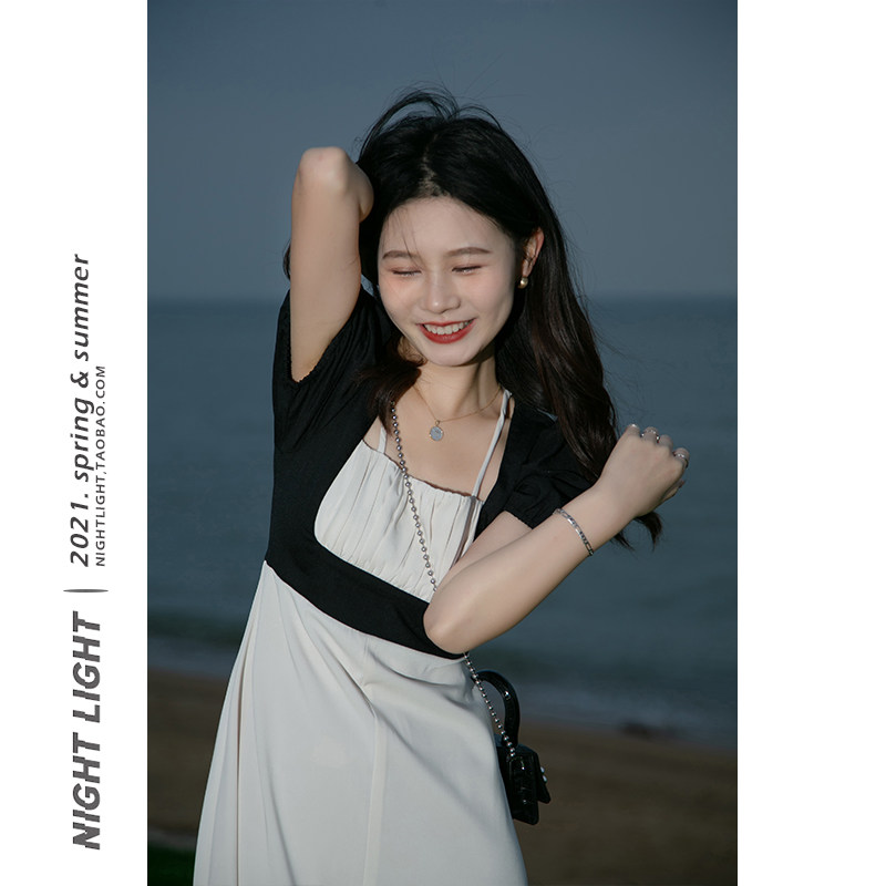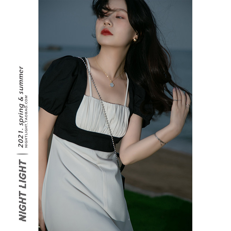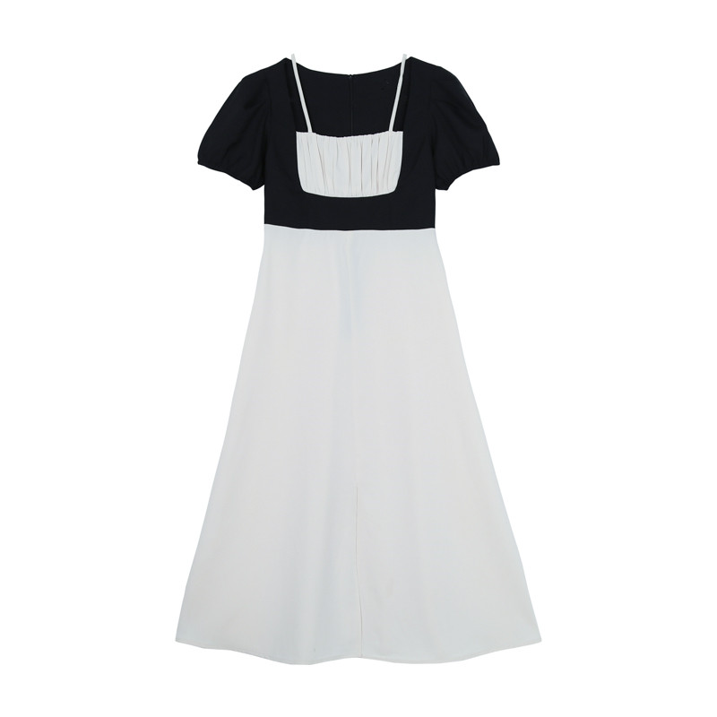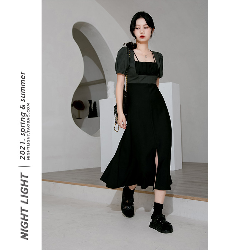 Fa-style square neck foam sleeves with summer harness fake two gentle wind temperament high waist skirt open fork medium long dress
