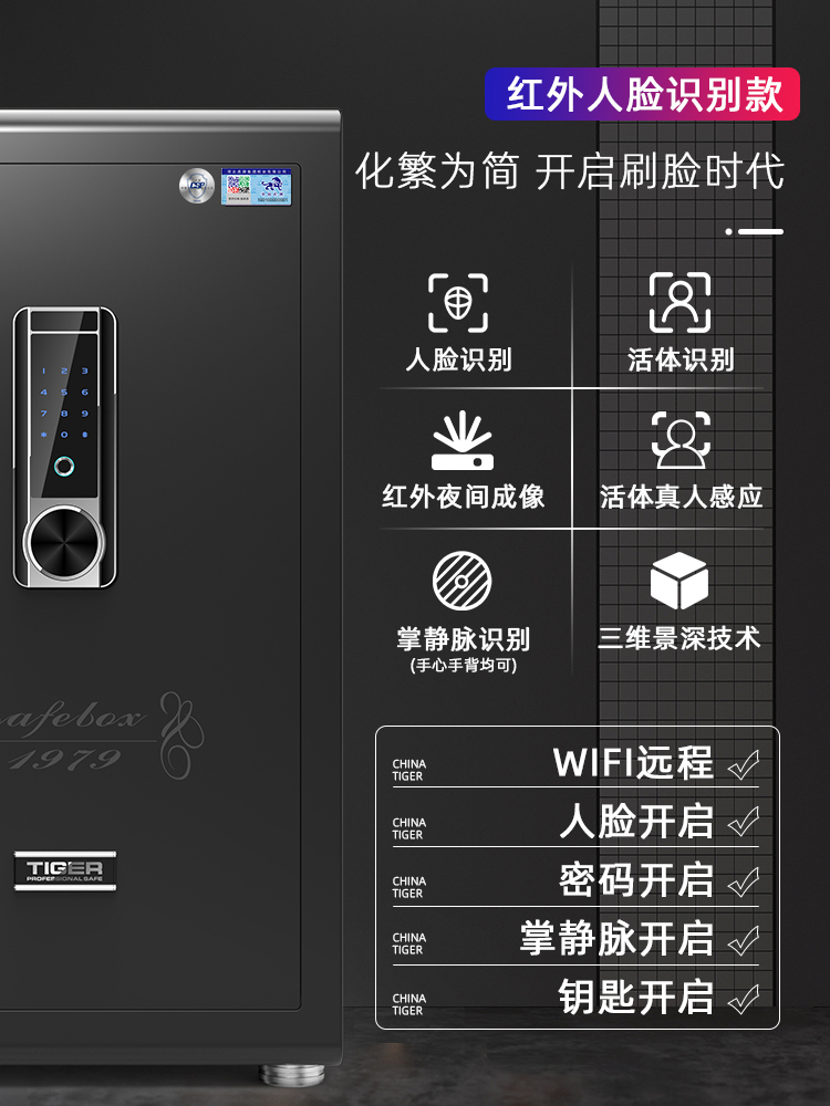 Tiger brand safe home small 3C certified face recognition 45 60 80 1 meter large safe all steel anti-theft invisible key fingerprint code lock office file commercial jewelry