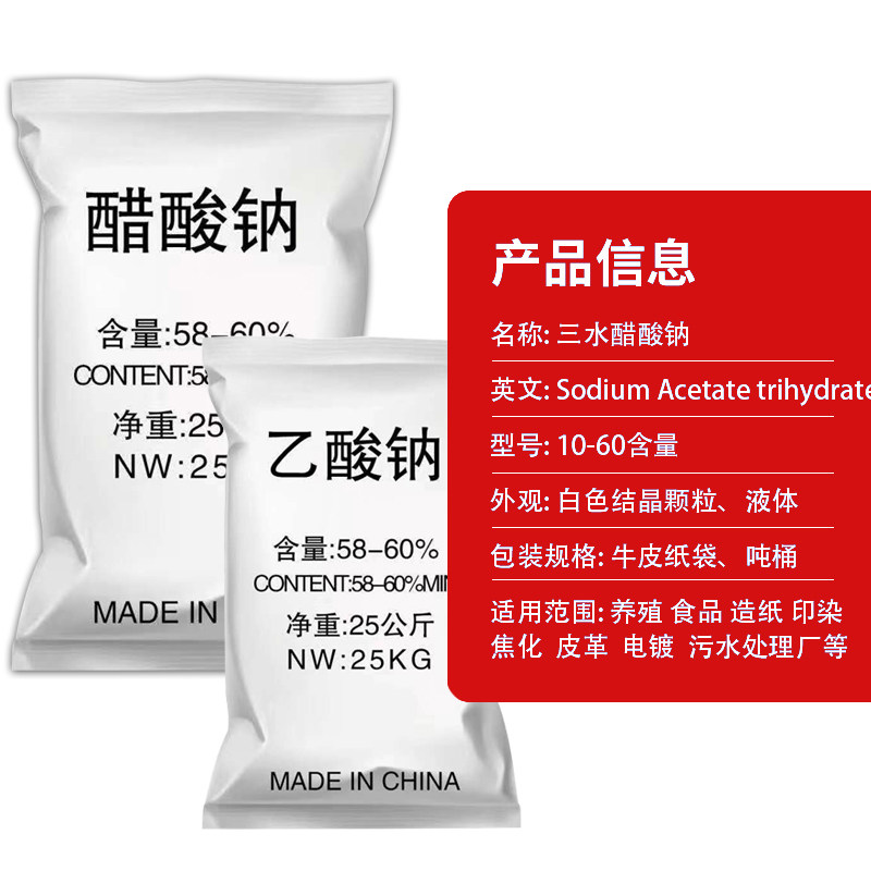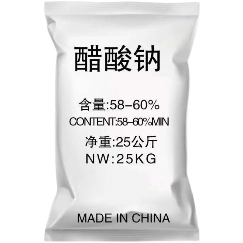 Experimental pack 1 kg Experimental pack 5 kg Sodium acetate 25 kg Common content 1 ton of national standard content 25 kg National standard content 1 ton of liquid sodium acetate Carbon source (1 barrel) Sodium acetate 25 kg