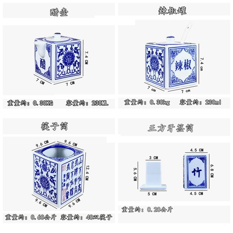 Salt shaker (send a small spoon) Sugar bowl (send a small spoon) Garlic can (send a small spoon) Monosodium glutamate (send a small spoon) Chili jar (send a small spoon) Oil and vinegar cans, sauce pots, oil pots, chopsticks, toothpick tubes (rectangular) Toothpick holder (round