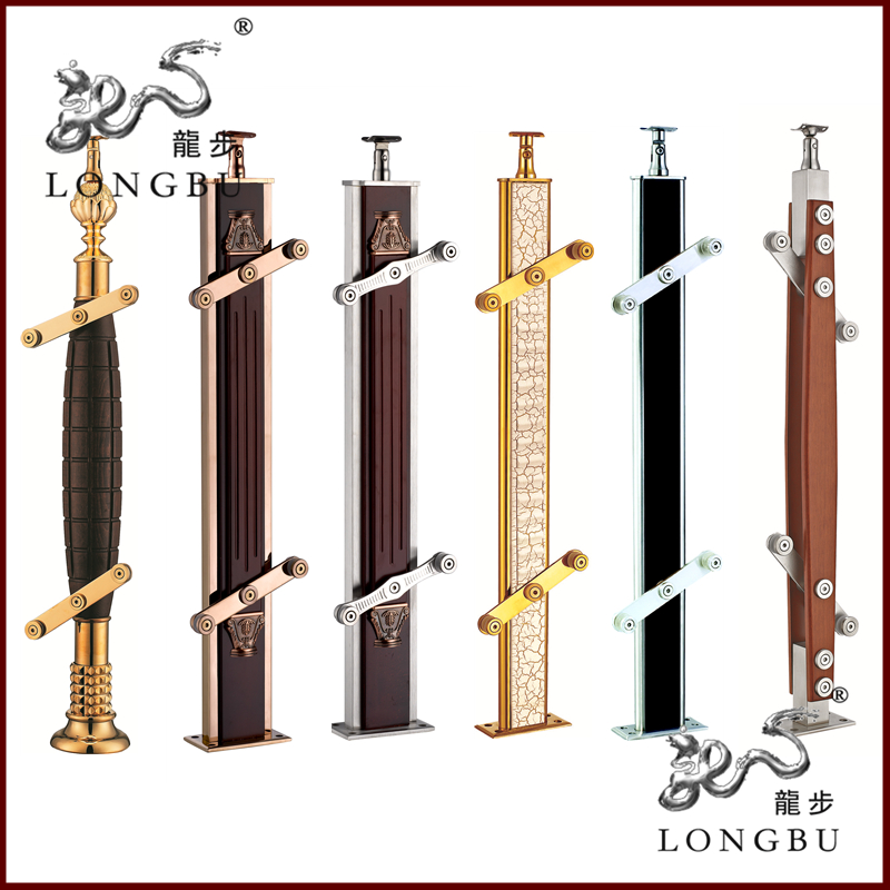 Guangdong Longstep Stainless Steel Solid Wood Stairway Armrest Titanium Alloy column brief duplex glass guard rail manufacturer with self-loading