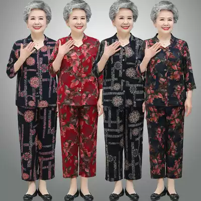 Middle-aged and elderly cotton silk pajamas set Female cardigan grandma summer cotton-padded mother's mid-sleeve old lady home clothes