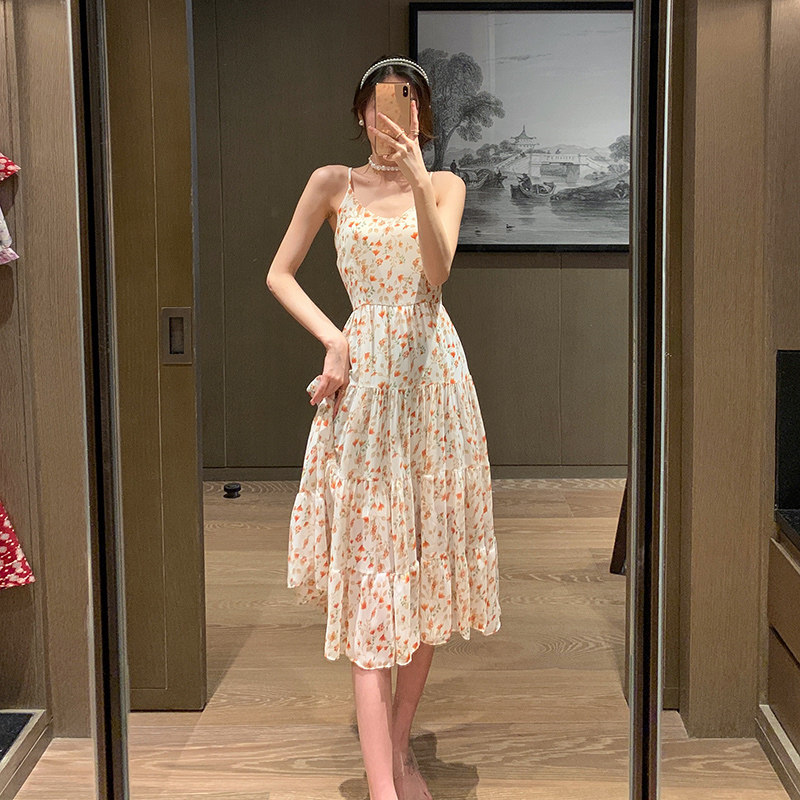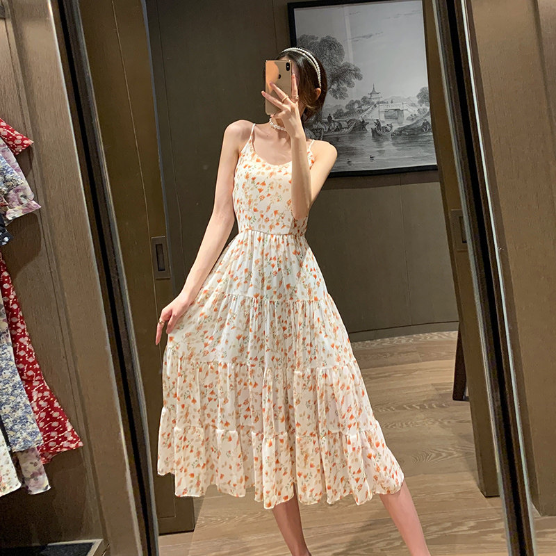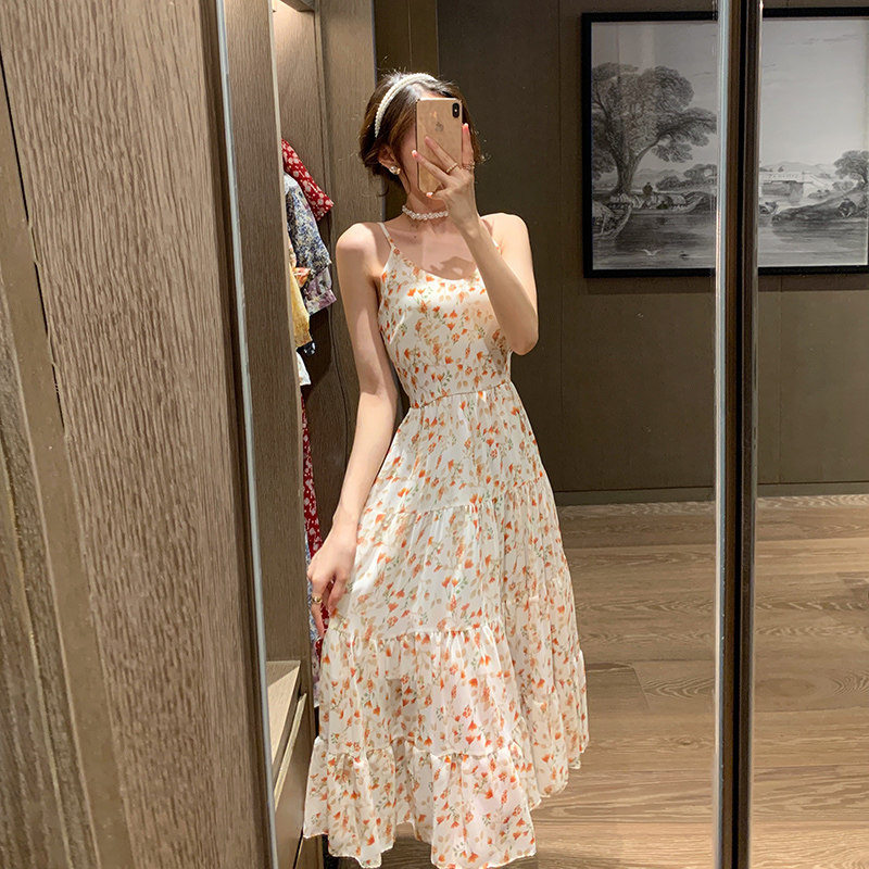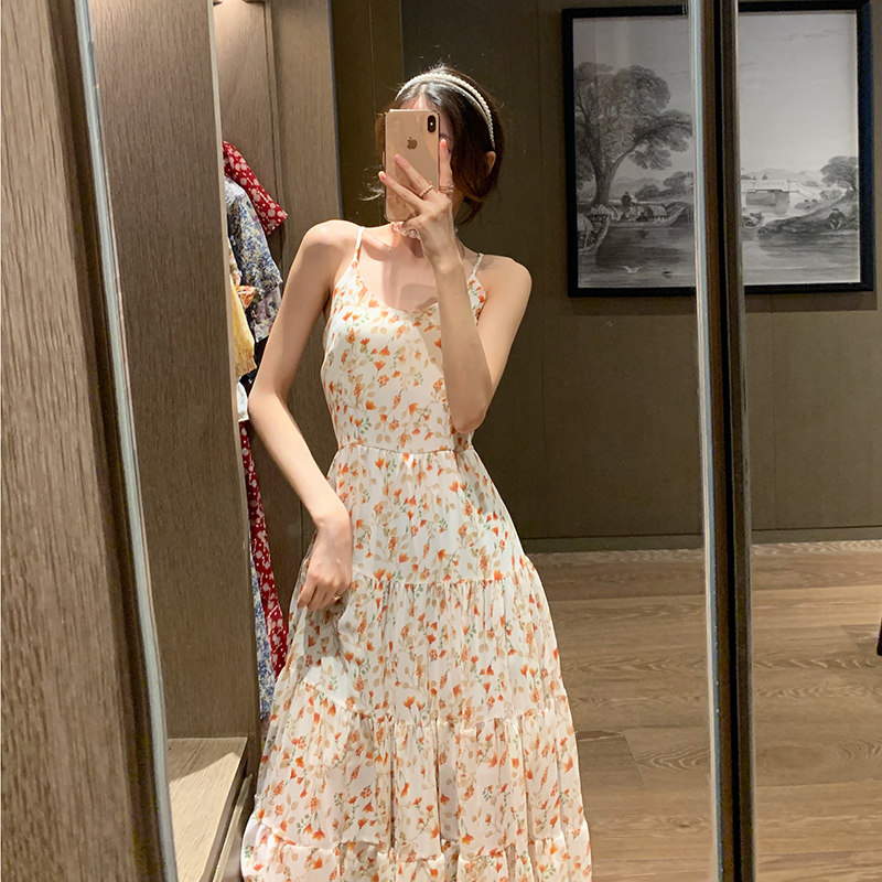 Sling floral dress waist 2021 summer new V-neck sweet small fresh chiffon skirt long version a-line skirt