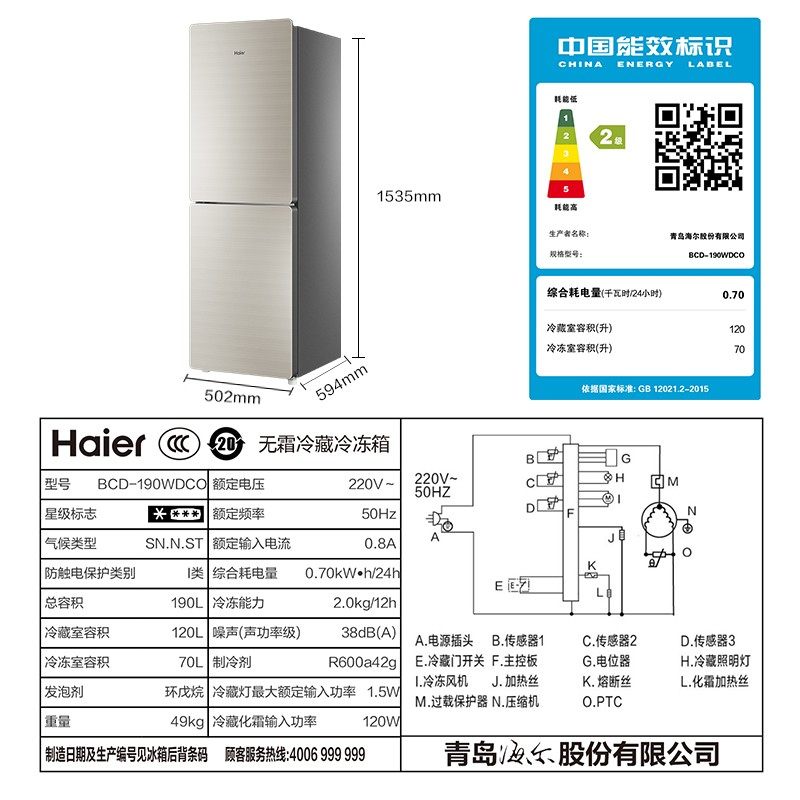 Haier Haier BCD-190WDCO air-cooled 190 liters Home Small two-door refrigerator Dormitory Rental Energy Saving