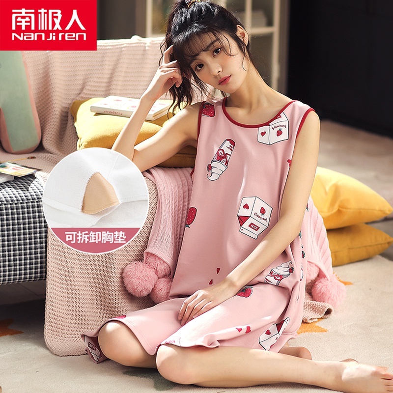Vest Sleeping Dress Lady Summer Pure Cotton Slim Fit Sleeveless Sleepwear With Chest Cushion Large Size Pregnant Woman Sexy Harness Ocean Dress
