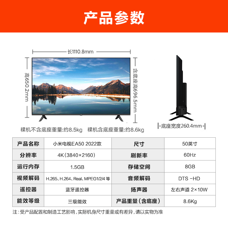 Xiaomi TV EA50 2022-50-inch 4K ultra-high-clear metal Full Screen Smart Voice LCD TV