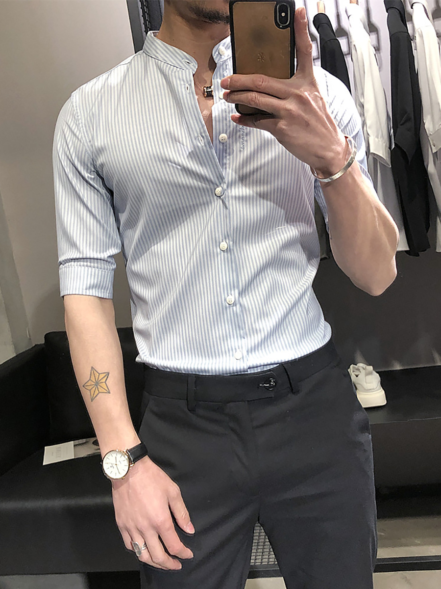 Men's Summer Thin Shirts Short Sleeves Korean Trend Slim Business Casual Stand Collar Striped Three-quarter Sleeve Shirts for Men