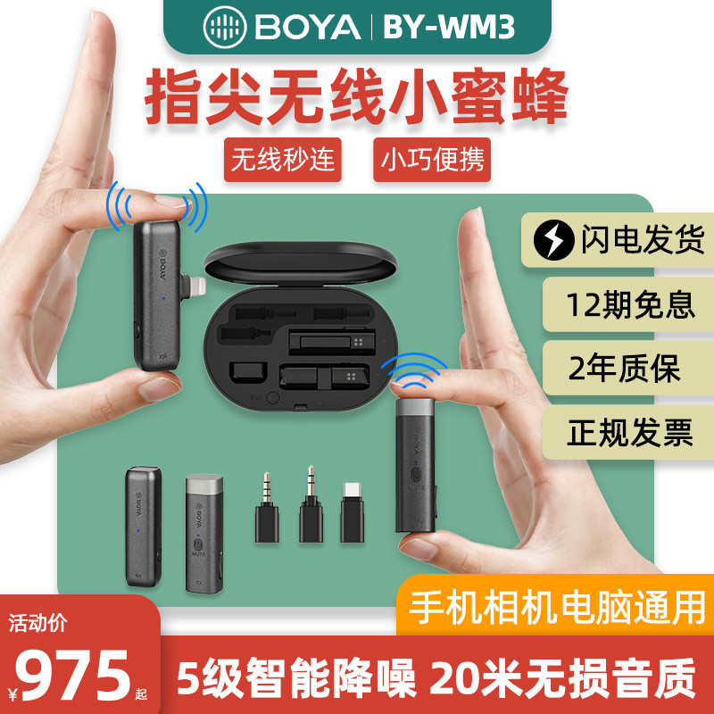 BOYA Boya WM3 Wireless Lavalier Microphone Bee Microphone Mobile Phone Camera Computer Mini Radio Microphone Live Douyin Professional Interview Short Video Noise Reduction Recording K Song Mai Equipment