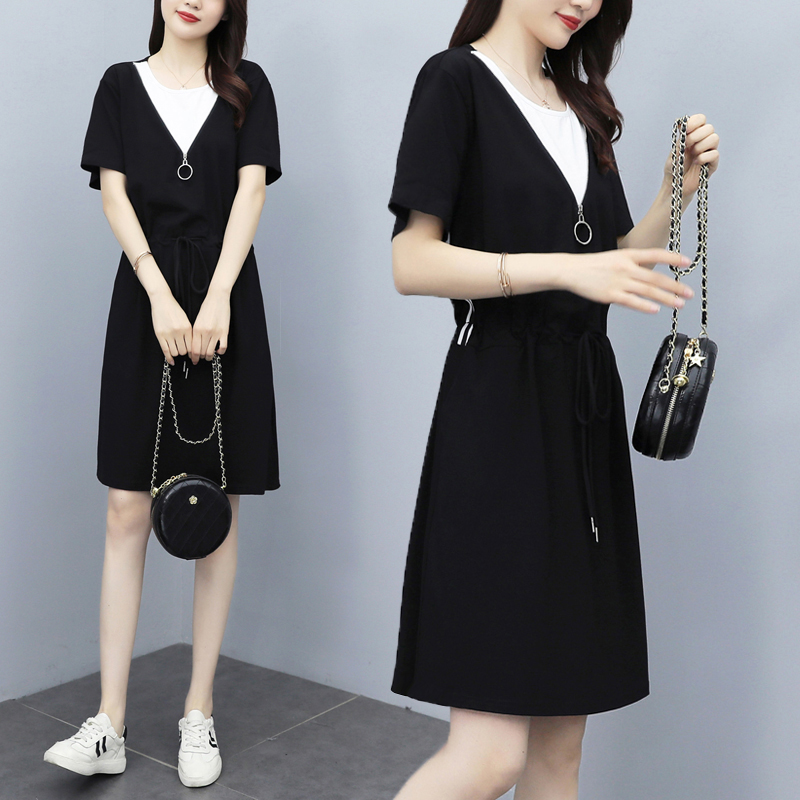 Dress 2022 new summer slim fit and thin fashion loose short-sleeved temperament mid-length version stitching little black dress women
