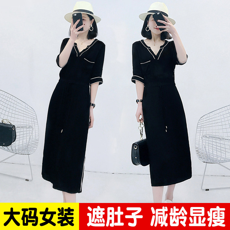 Large size dress for women fat mm200 catty summer new slimmer mid-length version of the foreign pie black snowspun dresses
