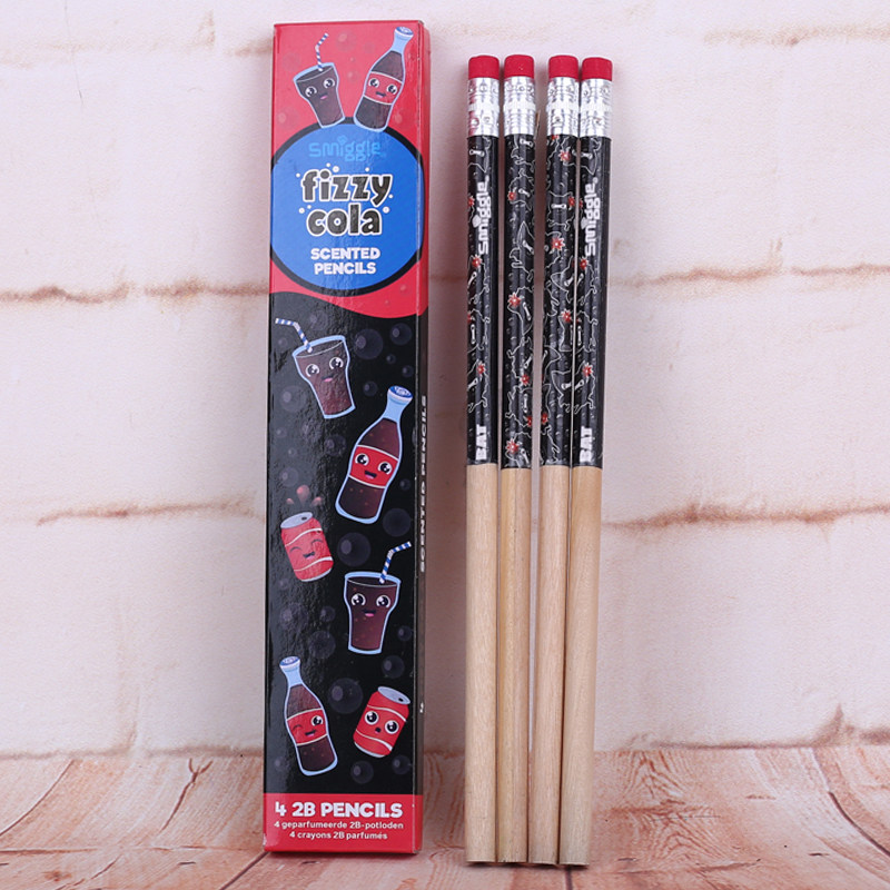 1 box of pink strawberry pencils 1 box of yellow banana pencils 1 box of brown chocolate pencils 1 box of black cola pencils 1 box
