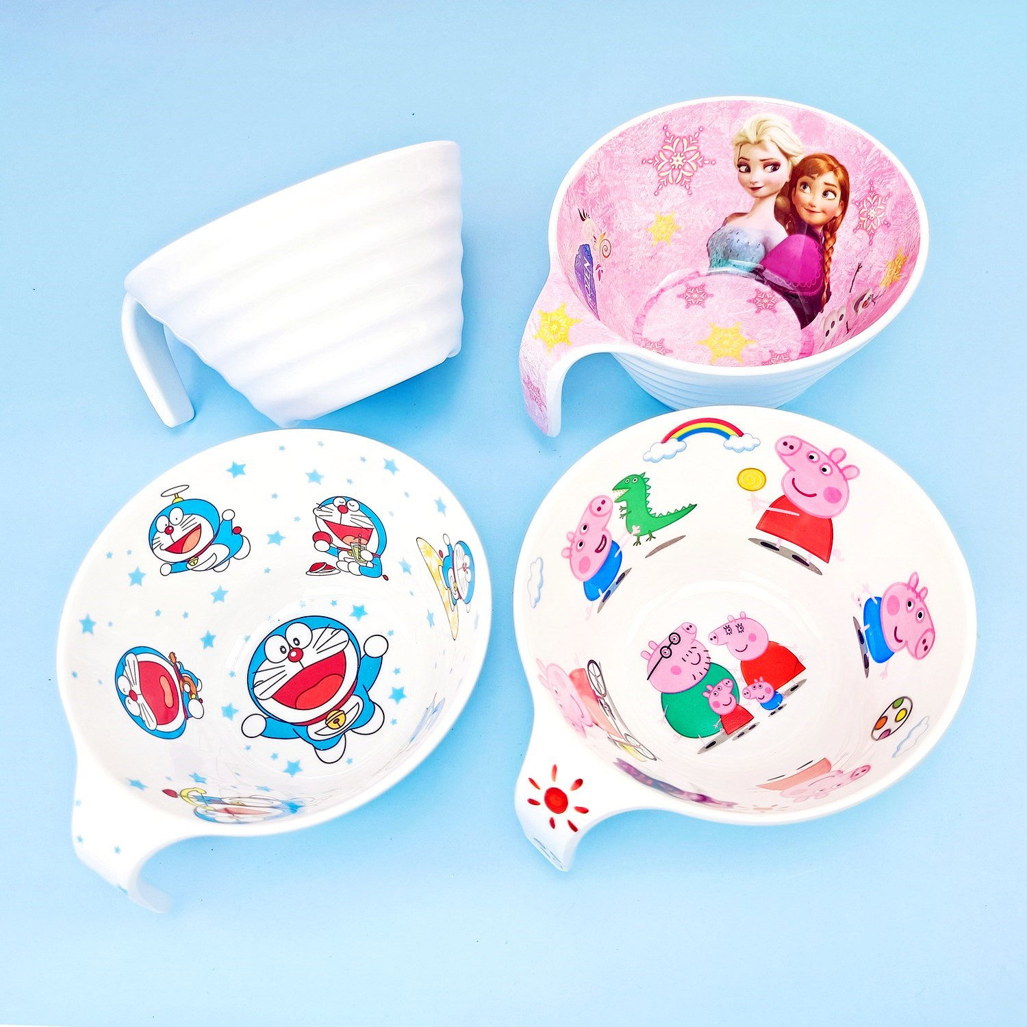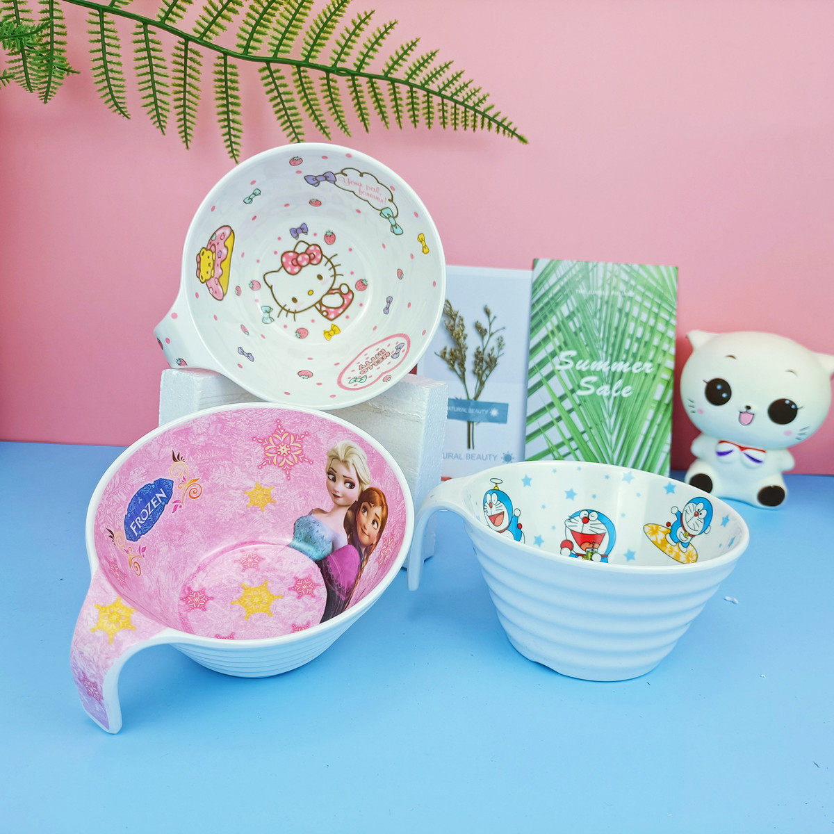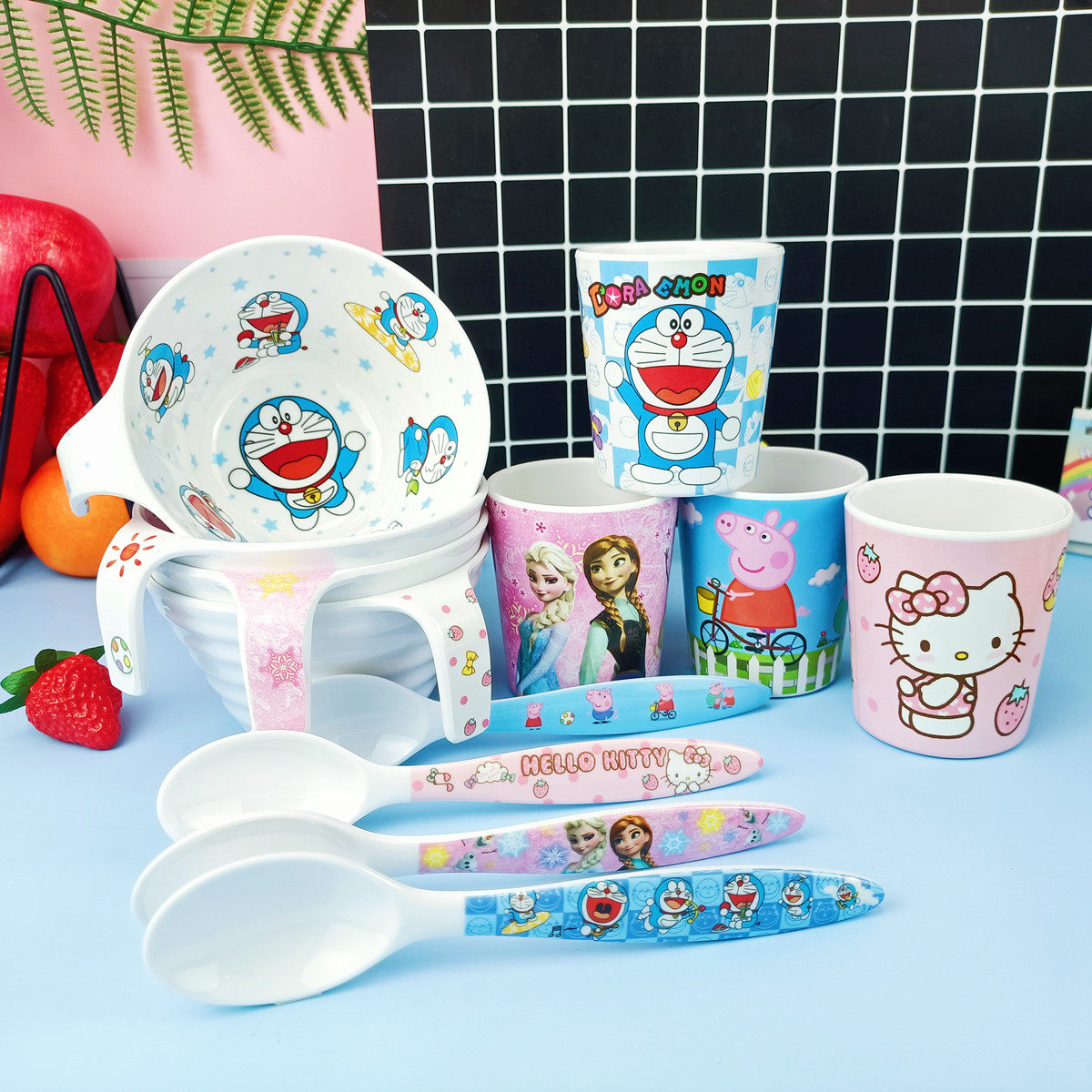 Piglet hands the bowl of snowman and snowman with the bowl of strawberry KT hands the bowl of piglets hands the spoon snowhands bowls, spoon cat hands a bowl, spoon strawberry KT hands a bowl, spoon pigs