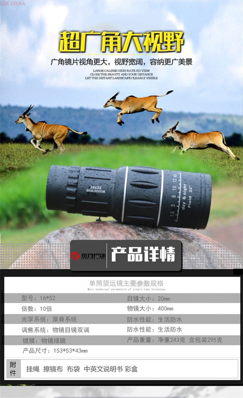 16X52 high-fold high definition micro-light double tone single-cylinder telescope outdoor birdwatching mirror competitive view mirror