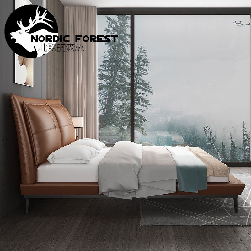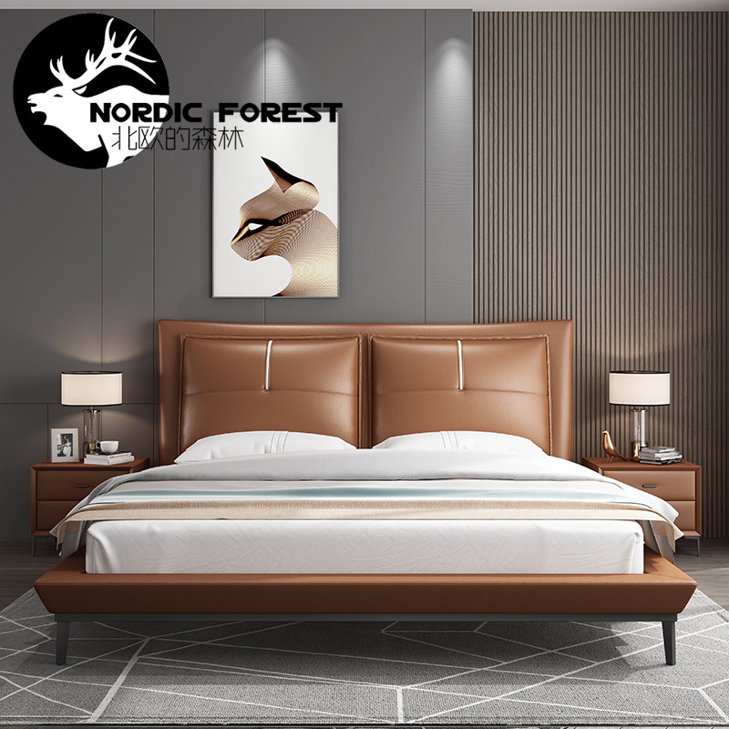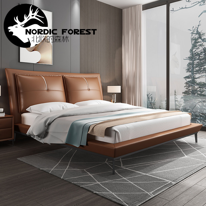 Nordic minimalist Italian-style first layer cowhide leather bed modern minimalist light luxury 1 8 meters bedroom master bedroom soft wedding bed